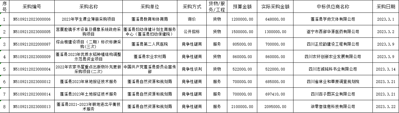 蓬溪县2023年3月政府采购项目汇总表