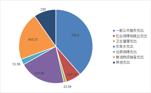 2024年一般公共预算财政拨款支出2065.33万元,主要用于以下方面:一般公共服务支出796.9万元,占38.58%;社会保障和就业(类)支出139.73万元,占6.77%;卫生健康支出23.59万元,占1.14%;农林水支出419.88万元,占20.33%;住房保障支出51.96万元,占2.52%;粮油物资储备支出433.27万元,占20.98%,其他支出200万元,占9.68%。