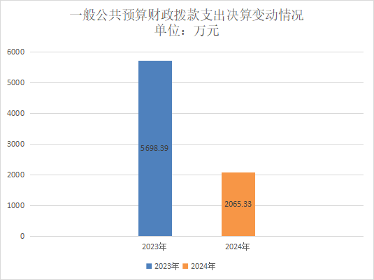 2024年一般公共预算财政拨款支出2065.33万元,占本年支出合计的9.01%。与2023年5698.39万元相比,一般公共预算财政拨款减少3633.06万元,减少63.76%。主要原因是资源勘探工业信息等支出减少。(图5:一般公共预算财政拨款支出决算变动情况)