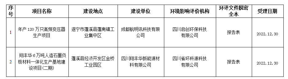 根据建设项目环境影响评价审批程序的有关规定,2022年12月30日我局受理2个建设项目环境影响评价文件。现将受理情况予以公告。如有建议意见,请于2022年1月6日(五个工作日)前向我局提出。