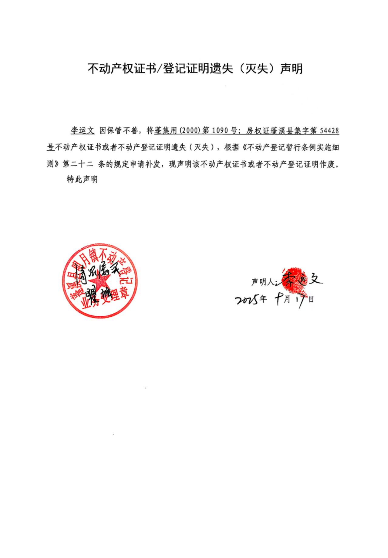 遗失补证公告(李运文)