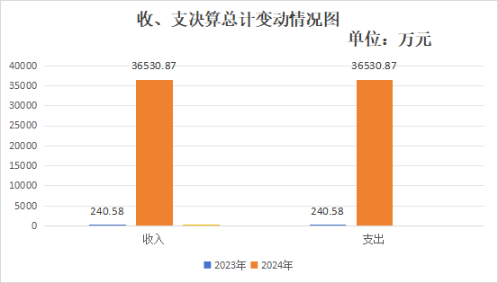 2024年度收、支总计均为36530.87万元。与2023年度相比,收、支总计各增加36290.29万元,增长15084%。主要变动原因是2024政府性基金预算财政拨款收入、国有资本经营预算财政拨款收入、城乡社区支出、国有资本经营预算支出增加。