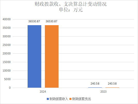 2024年度财政拨款收、支总计均为36530.87万元。与2023年度相比,收、支总计各增加36290.29万元,增长15084%。主要变动原因是2024政府性基金预算财政拨款收入、国有资本经营预算财政拨款收入、城乡社区支出、国有资本经营预算支出增加。