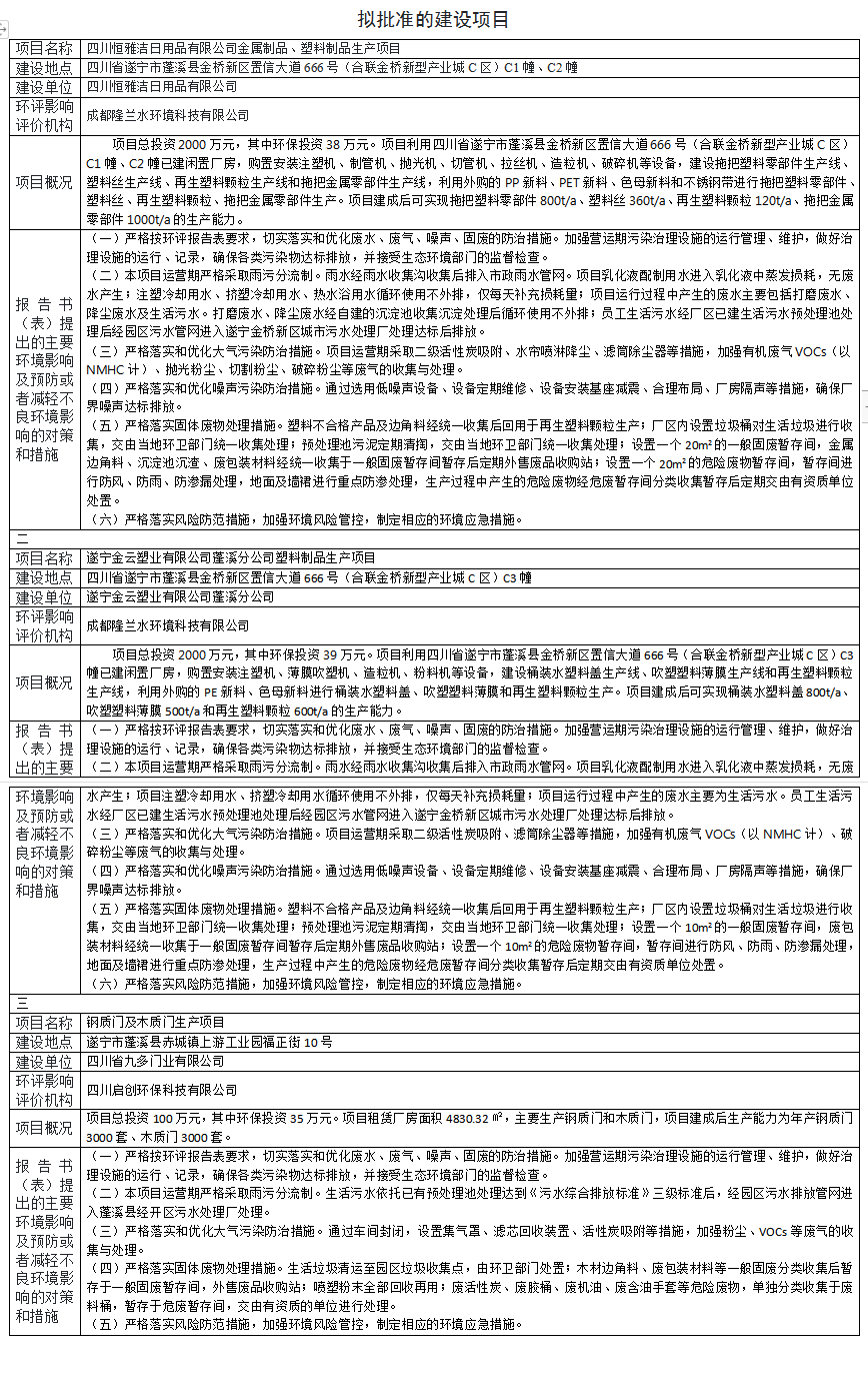 根据建设项目环境影响评价审批程序的有关规定,经审议,我局拟对3个建设项目环境影响报告表作出批复决定。为保证此次审议工作的严肃性和公正性,现将建设项目环境影响报告表的基本情况予以公示。公示期为2022年10月26日-2022年11月1日(共5个工作日)。