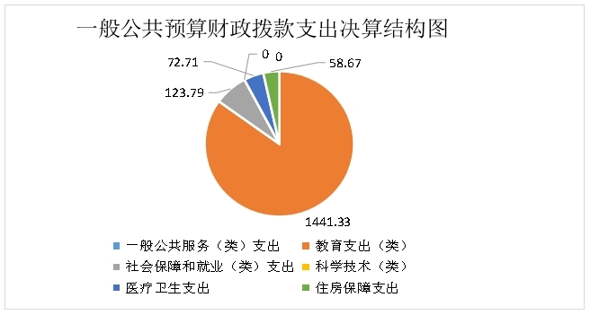 2024年度一般公共预算财政拨款支出1696.50万元,主要用于以下方面:一般公共服务支出0万元,占0%;教育支出1441.33万元,占84.96%;科学技术支出0万元,占0%;文化旅游体育与传媒支出0万元,占0%;社会保障和就业支出123.79万元,占7.30%;卫生健康支出72.71万元,占4.28%;住房保障支出58.67万元,占3.46%。