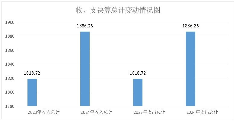 2024年度收、支总计均为1886.25万元。与2024年度相比,收、支总计各增加67.53万元,增长3.71%。主要变动原因是本年度人员变化、年终绩效考核经费、增资、调资等费用增加。