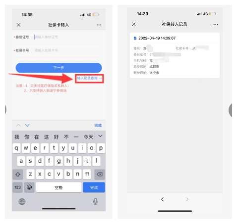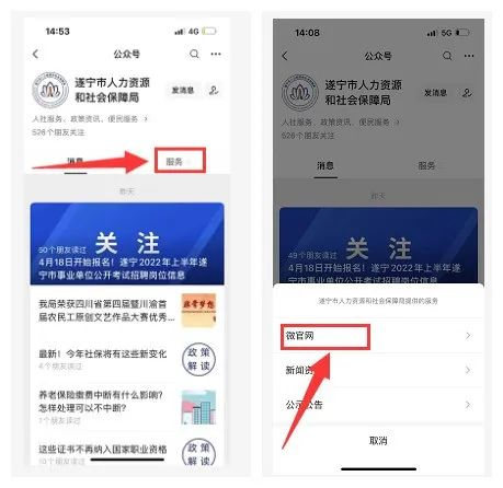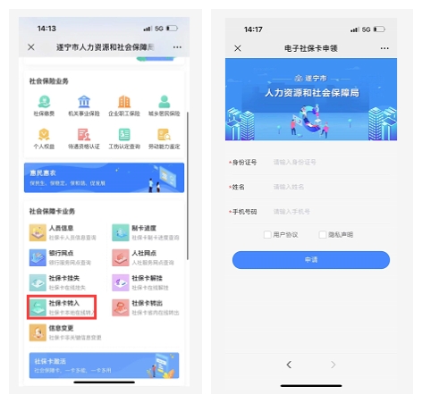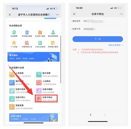关注“遂宁市人力资源和社会保障局” 公众号,进入服务里面点击“微官网”,找到“社保卡转入”或者“社保卡转出”图标点击进入。有电子社保卡的先用电子社保卡登陆,没有申领电子社保卡的根据提示信息领取成功之后再进行“社保卡转入”、“社保卡转出”相关操作。