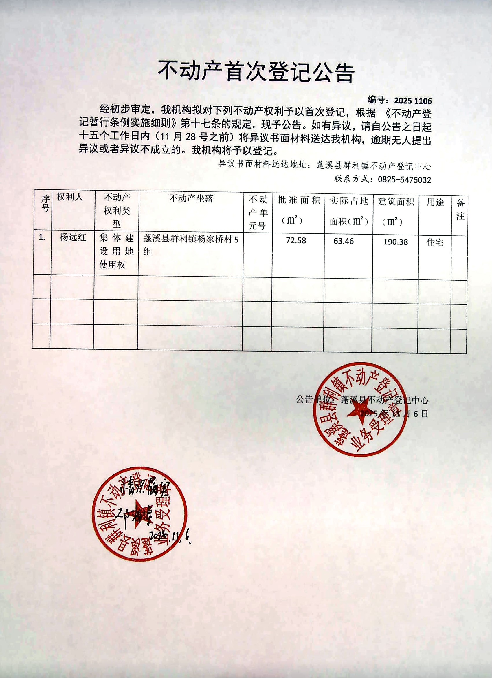 首次登记公告(杨远红)