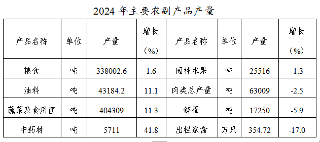 全年农作物播种面积87751.9公顷,同比增长2.2%。其中:粮食作物60403.0公顷,同比增长0.5%;油料作物15423.0公顷,同比增长10.1%;蔬菜瓜果类9305.3公顷,同比增长1.6%;药材668.6公顷,同比增长38.2%。全年粮食产量338002.6吨,同比增长1.6%;油料总产量43184.2吨,同比增长11.1%。