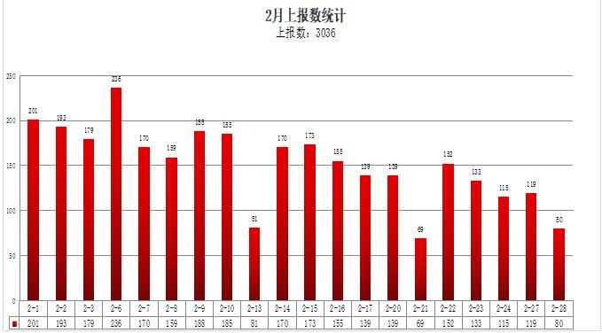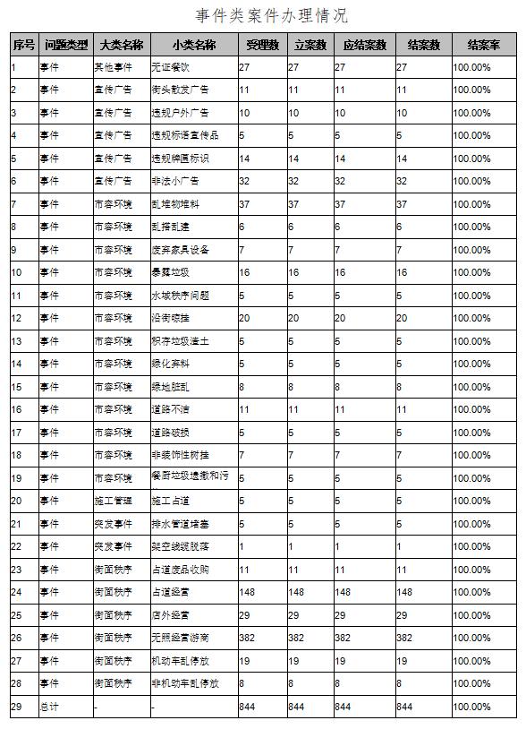 蓬溪县数字城管2023年2月共上报3036件。其中信息采集上报1330件,自行处置上报1706件。立案1328件,事件类立案844件,部件类立案484件。应结案1328件,结案1328件,结案率100%,按期结案1328件,按期结案率100%。