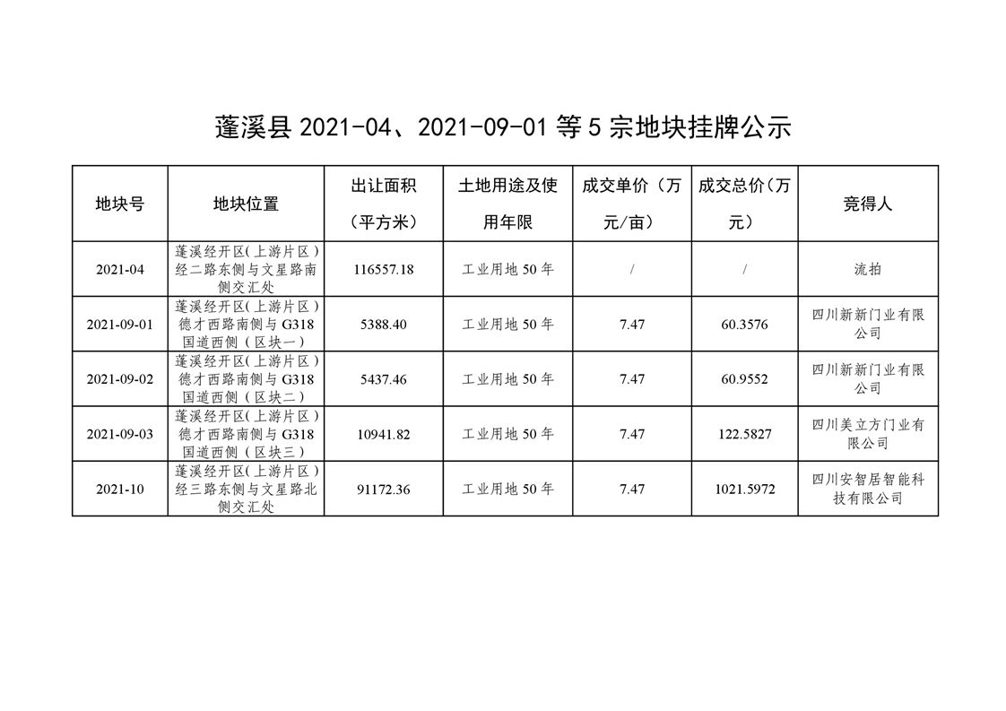 蓬溪县2021-04、2021-09-01等5宗地块挂牌成交公示