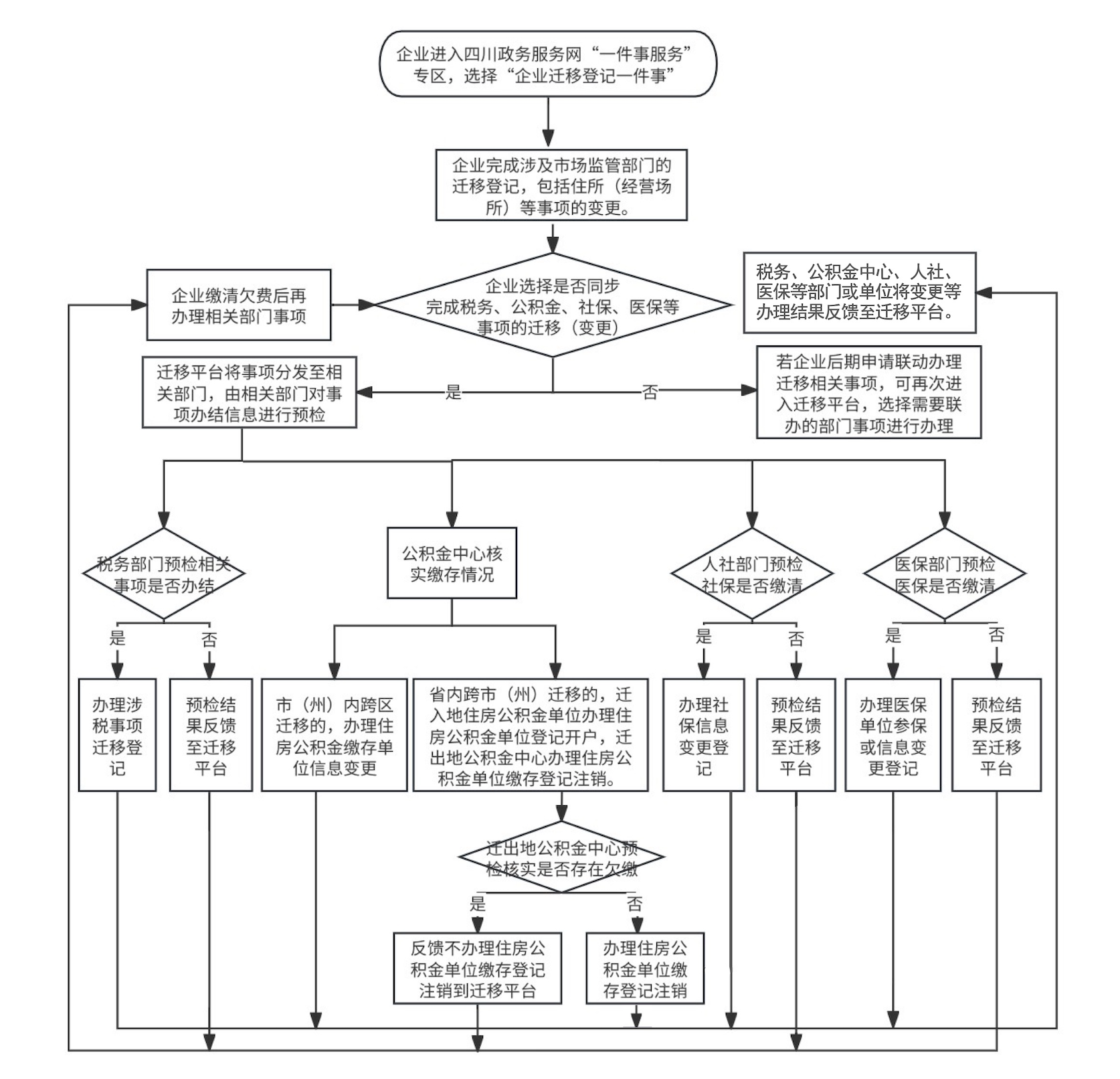 线上办理:申请人在互联网进入“四川政务服务网”—“一件事服务”专区—“企业迁移登记一件事”,通过法人登录后根据系统提示进行操作。