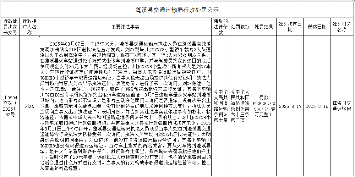 蓬溪县交通运输局行政处罚公示