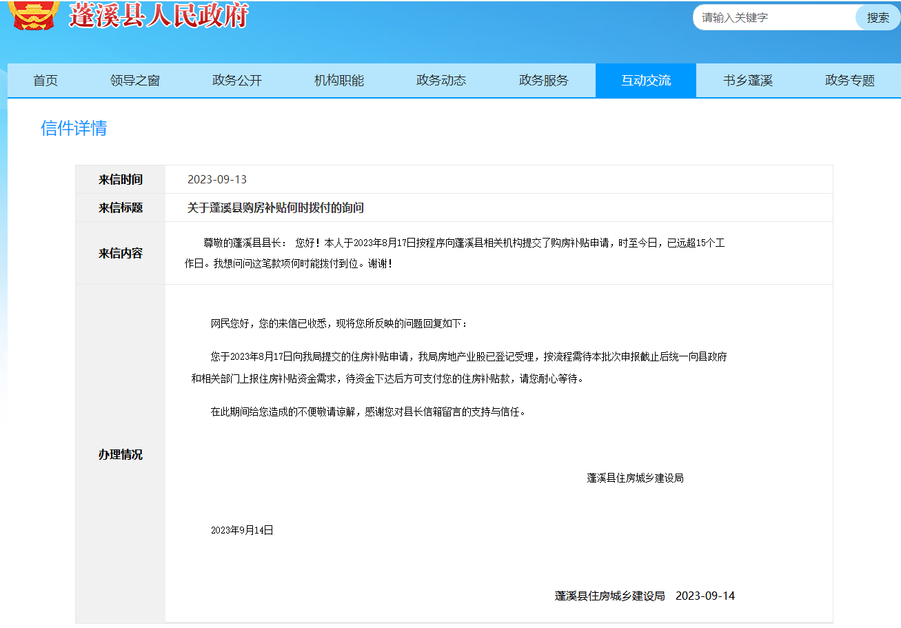 | 来信标题 | 关于蓬溪县购房补贴何时拨付的再询问 |
