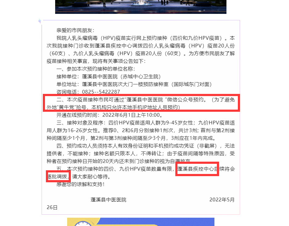 6月1日,有一批HPV疫苗通过知苗易约进行预约登记,该批疫苗由蓬溪县疾控中心调拨,蓬溪县中医医院进行公告及后续的接种。在公告时,并未提及会对身份证进行限制,但在预约时,我被提示身份证不在预约范围。HPV疫苗本就稀少,如果有设置条件是否在公告时就应提前告知,暗中设置预约门槛,是否是暗箱操作,方便控制疫苗登记,方便售卖给本地黄牛?