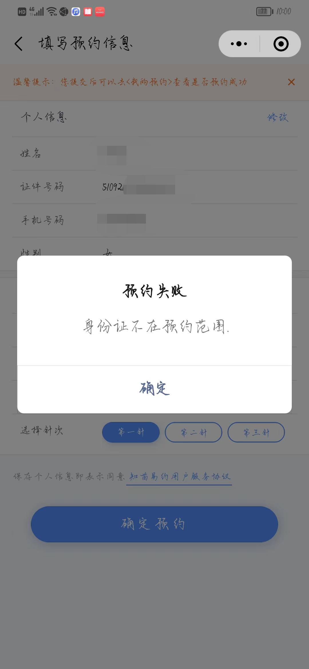 | 来信标题 | HPV疫苗预约显示身份证不在预约范围 |