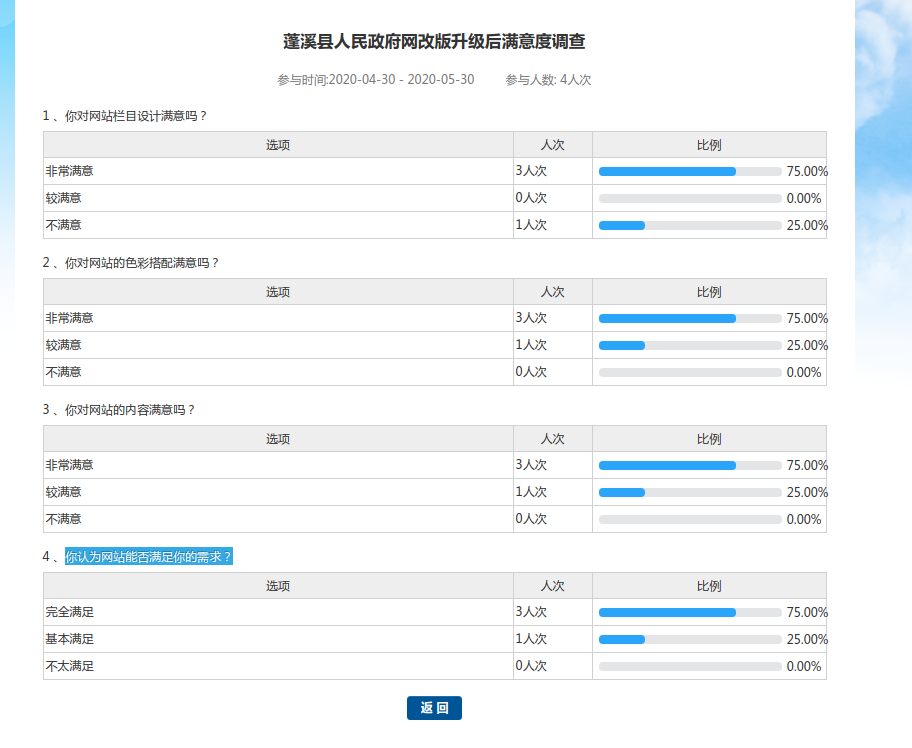 截至2020年5月30日,本次调查问卷共4人次参与,从本次调查结果来看网站栏目设计非常满意度为75.00%,不满意度为25%;网站的色彩搭配非常满意度达75.1%,较满意为25%;网站的内容非常满意度达75.1%,较满意为25%;网站完全满足网友需求比例为75.1%基本满足比例为25%。