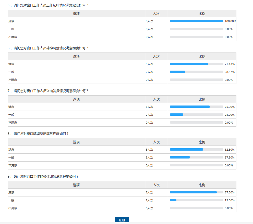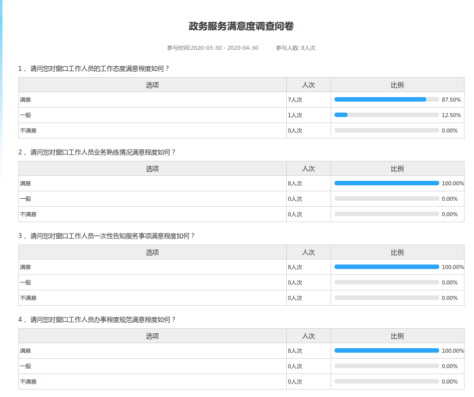 截至 2020年4月30日,本次调查问卷共8人次参与,从本次调查问卷来看,我县“政务服务满意度”调查中,群众对窗口工作人员的工作态度满意程度达87.50%,对窗口工作人员业务熟练情况满意程度达100.00%,对窗口工作人员一次性告知服务事项满意程度达100.00%,对窗口工作人员办事程度规范满意程度达100.00%,对窗口工作人员工作纪律情况满意程度达100.00%,对窗口工作人员精神风貌情况满意程度达71.43%,对窗口工作人员咨询答复情况满意程度达75.00%,对窗口环境整洁满意程度达62.50%,对窗口工作的整体印象满意程度达87.50%。