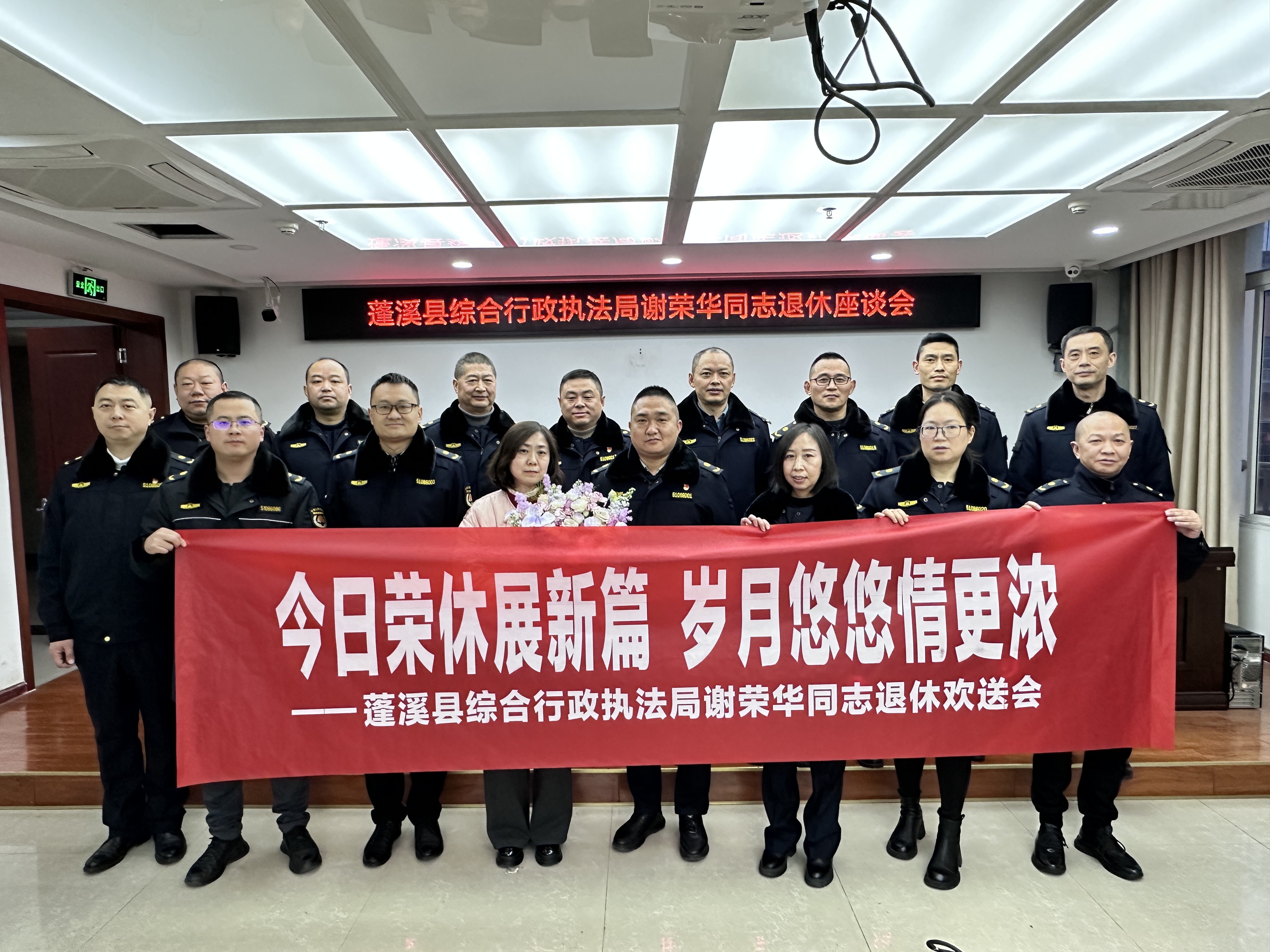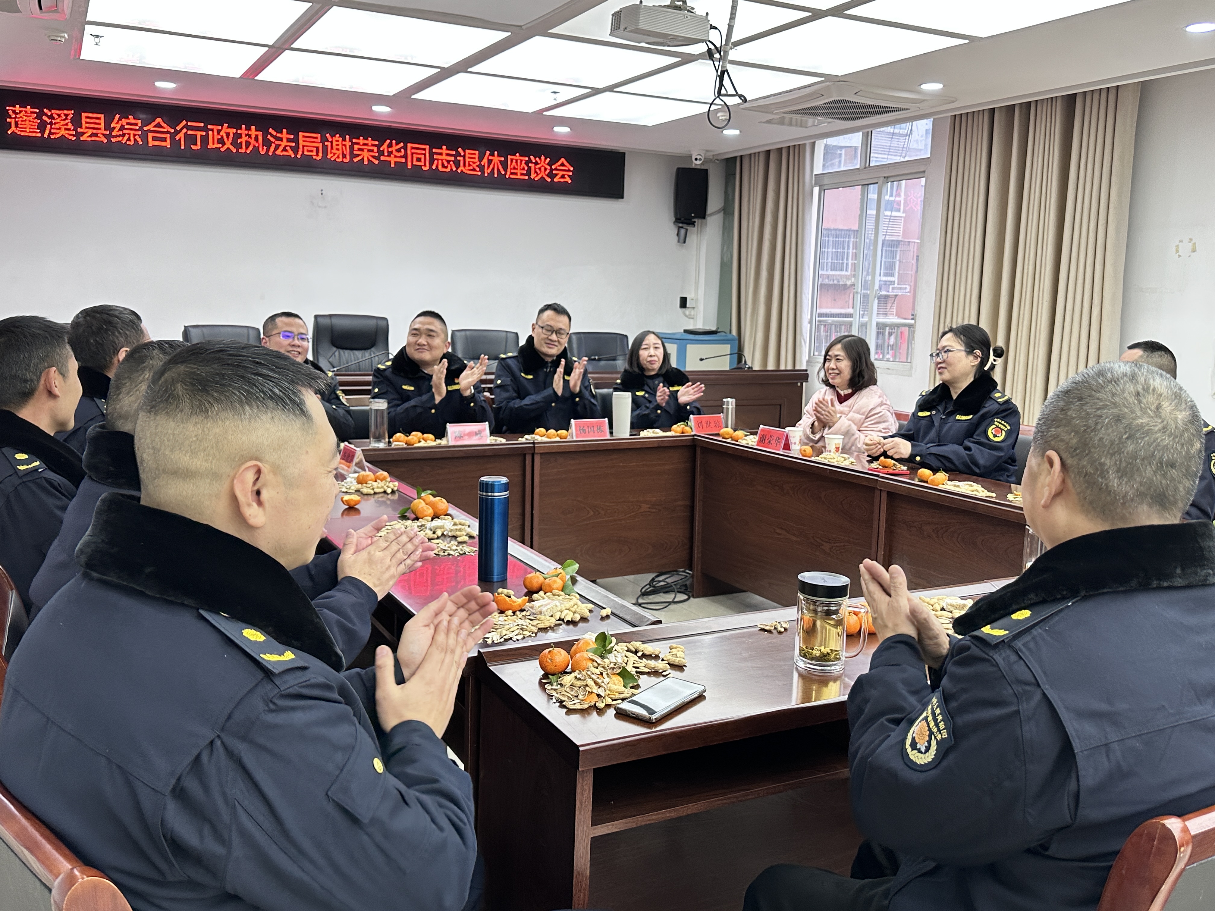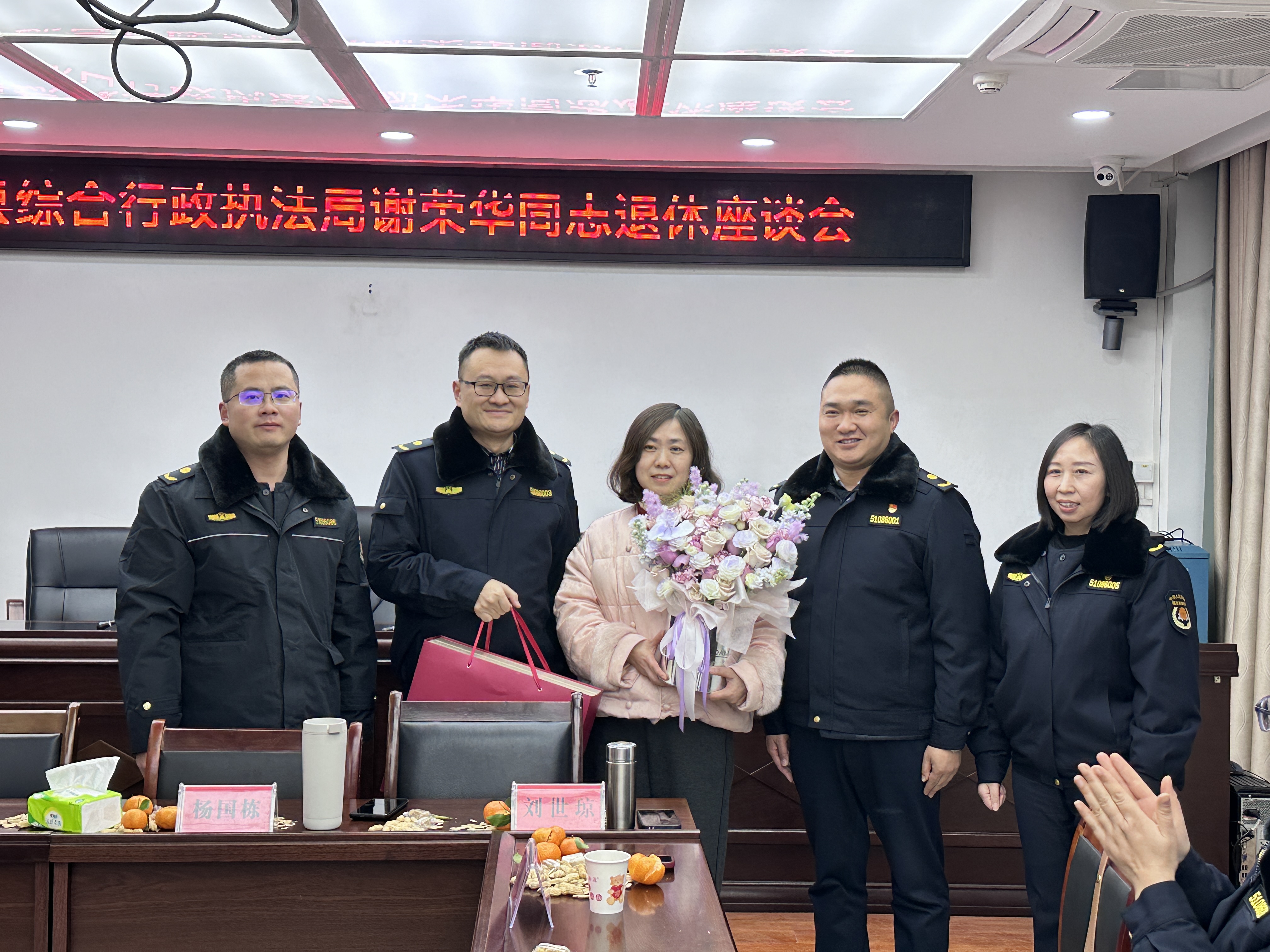 为感谢谢荣华同志为综合执法事业发展做出的贡献和辛勤付出,进一步增强全体职工凝聚力和归属感,1月7日下午,蓬溪县综合行政执法局举办退休职工欢送会。局领导班子,各股室队负责人及相关股室干部职工约20人参加。