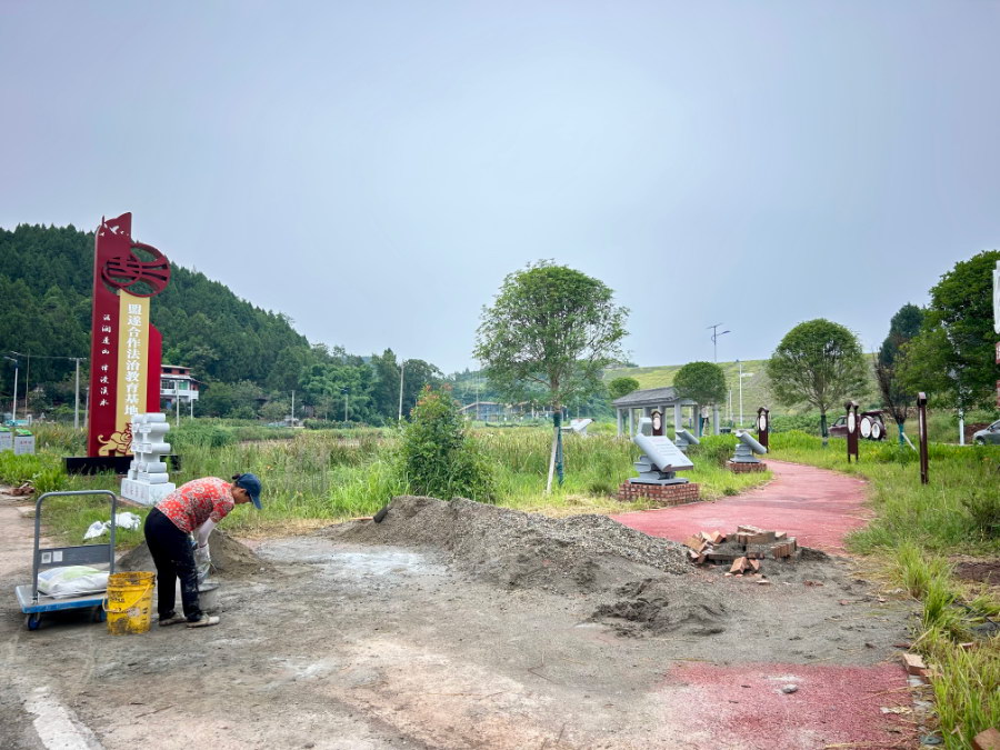 9月5日,蓬溪县文井镇白鹤林村的盟遂合作法治教育基地建设现场一片热火朝天。工人们各司其职,加紧推进地砖安装、杂草清理等配套设施收尾工作,全力向9月中旬竣工交付的目标冲刺,为当地法治文化阵地建设按下“加速键”。