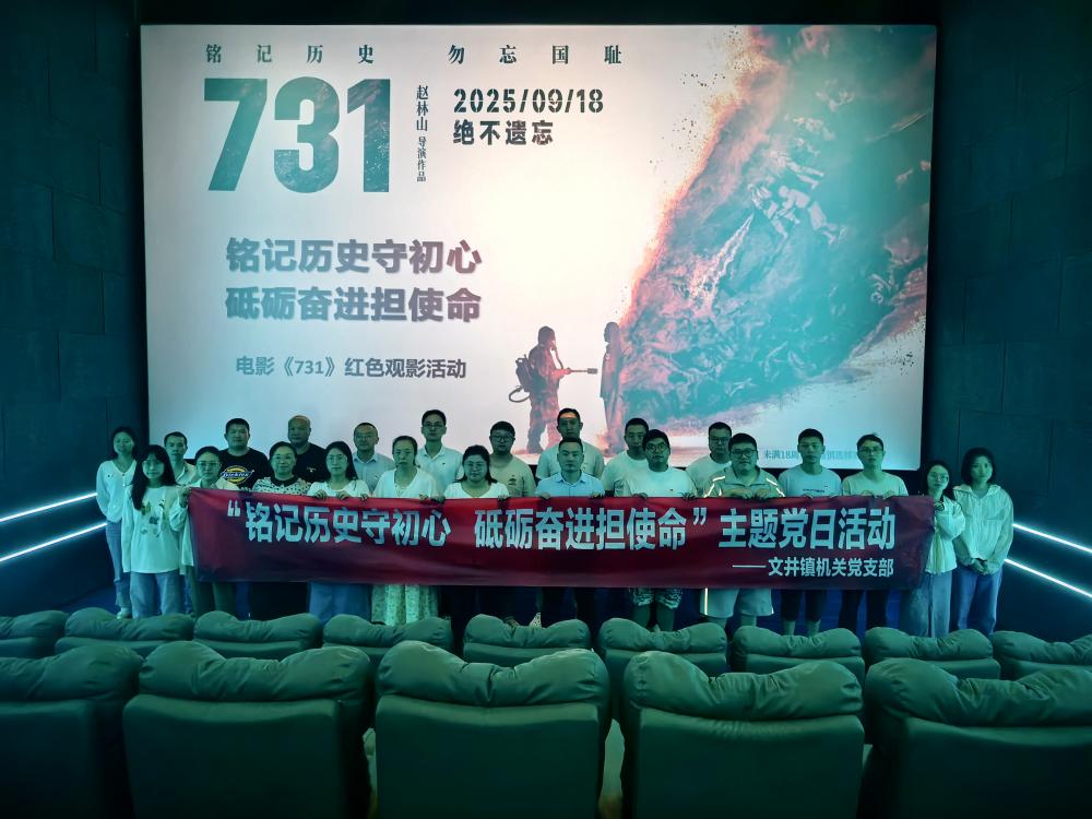 为纪念中国人民抗日战争暨世界反法西斯战争胜利80周年,铭记历史、缅怀先烈,进一步增强机关党员干部的民族责任感与使命感,9月18日晚,文井镇机关党支部组织党员干部开展“铭记历史守初心、砥砺奋进担使命”主题党日活动,集体观看重大历史题材影片《731》。