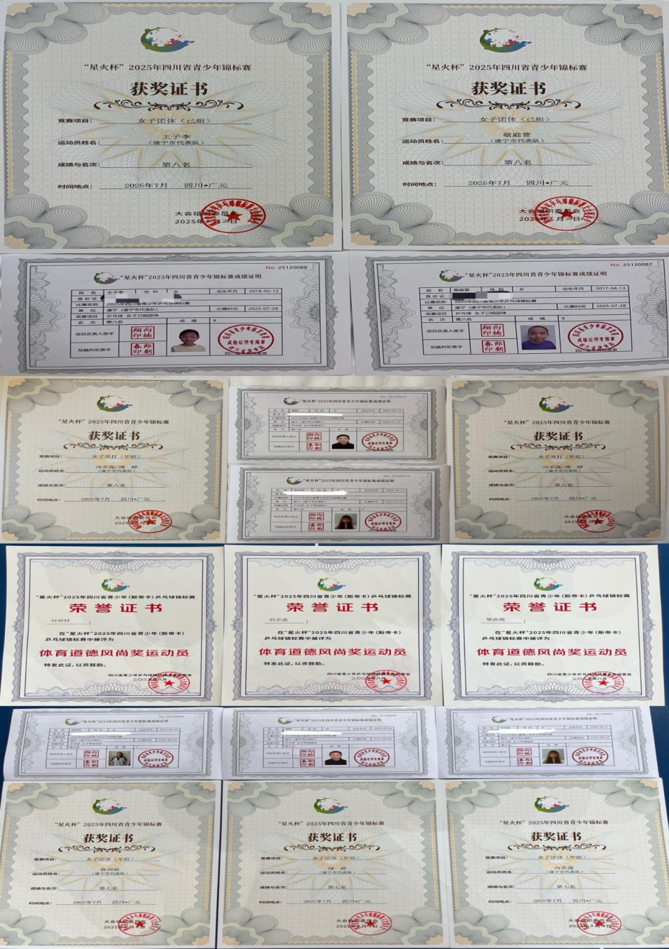 经过多轮紧张激烈的比拼,遂宁市代表队的蓬溪籍球员收获颇丰。敬庭萱、王子李在己组女子团体比赛中荣获第八名;向芯蕊与周婷(安居)搭档,在甲组女子双打项目中拿下第八名,凭借这一成绩,她们二人获得了国家二级运动员的称号;团体赛中,队伍齐心协力,最终取得甲组女子团体第七名的好成绩。此外,何雨轩、敬庭源因在赛场内外展现出的良好体育道德风貌,荣获 “体育道德风尚奖运动员” 称号。