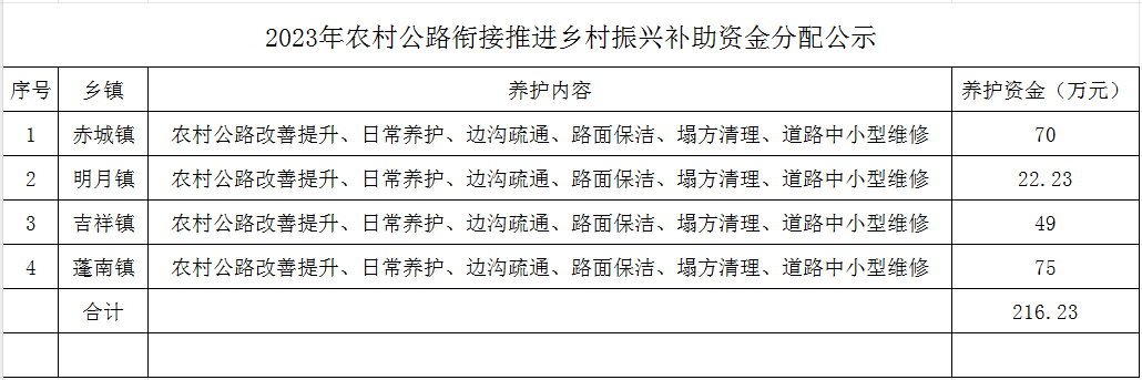 蓬溪县2023年农村公路衔接推进乡村振兴补助资金分配公告