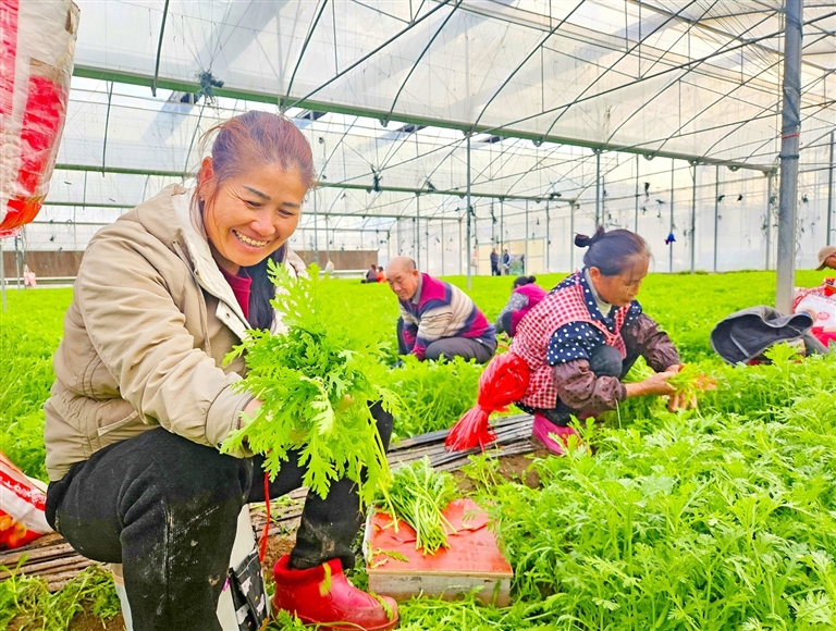 去年10月,红江镇创新推行“新农人带头+村集体入股+企业共营+农户参与”合作模式,引进专业公司发展大棚茼蒿230余亩。依托当地良好的土质、完善的设施,茼蒿可从10月种到次年3月,连续播种两茬。