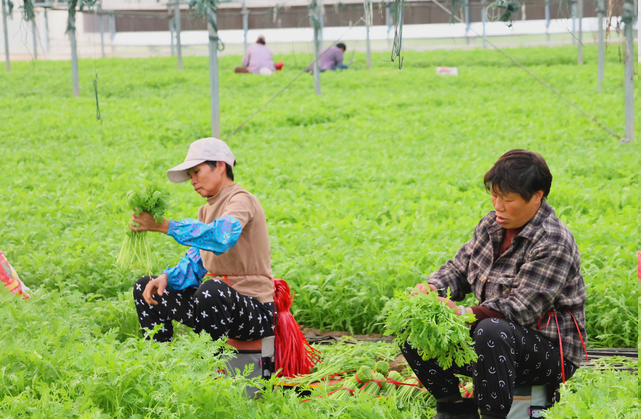在罗文文身后,工人们正将刚采收的茼蒿整理入箱。这些茼蒿经过预冷保鲜,构建了从田间到餐桌24小时全闭环供应链,当天即可直达陕西西安市场。目前,基地每天发往西安的茼蒿达7吨,亩产约1500公斤,年产值达2000万元。