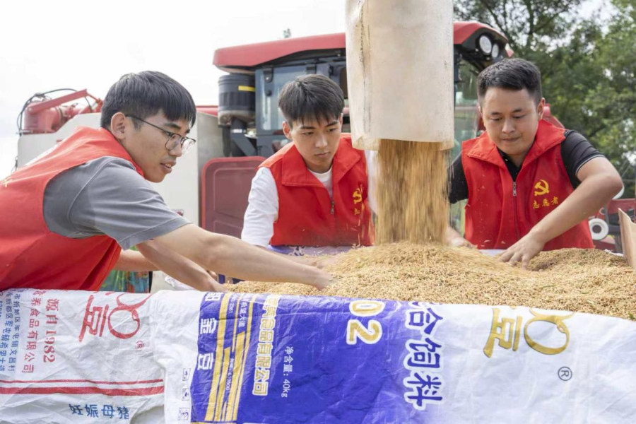 “红色冲锋队”扶农助农分队队员帮农户抢收水稻。