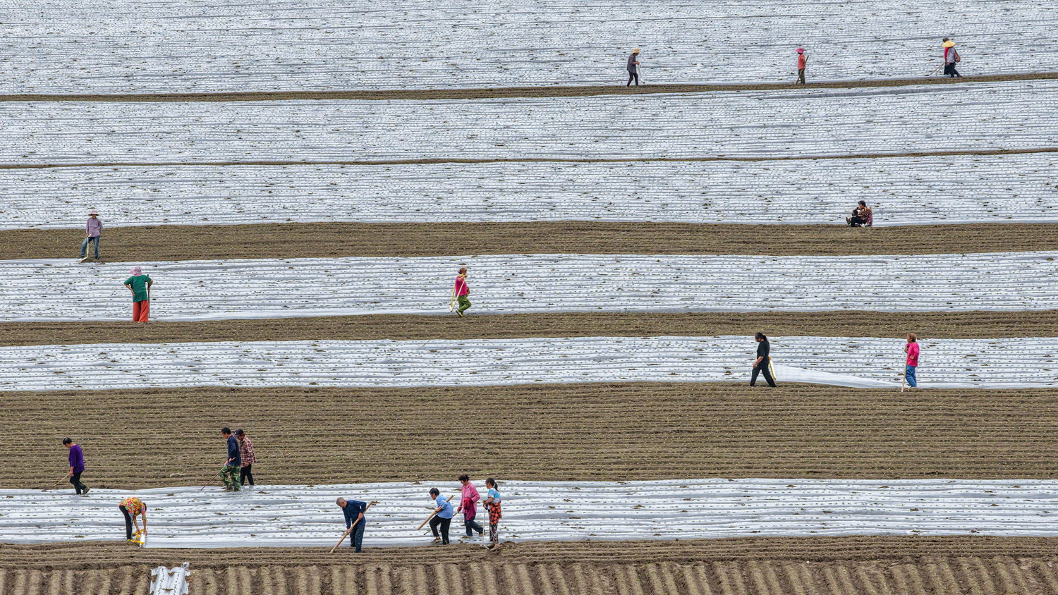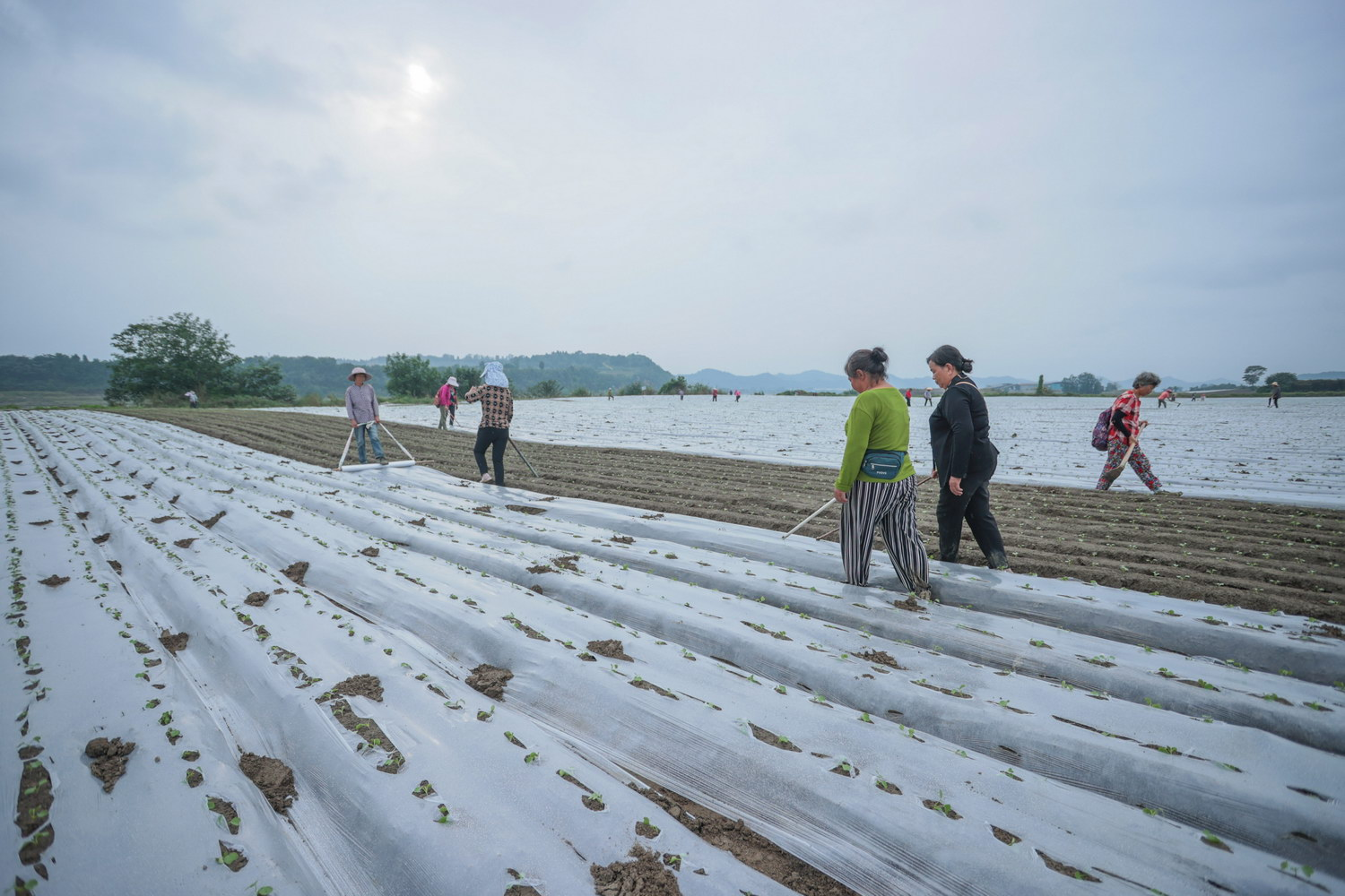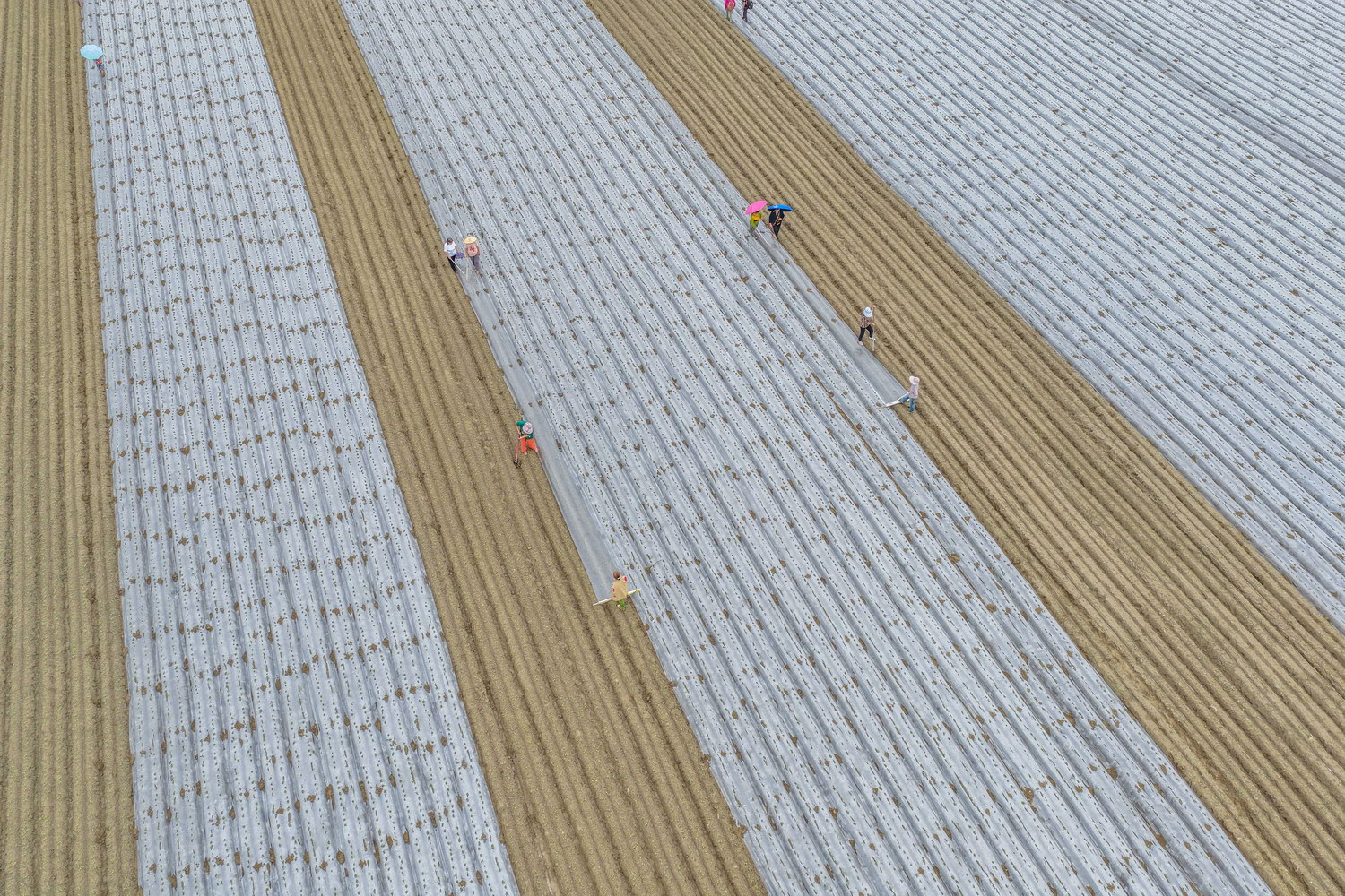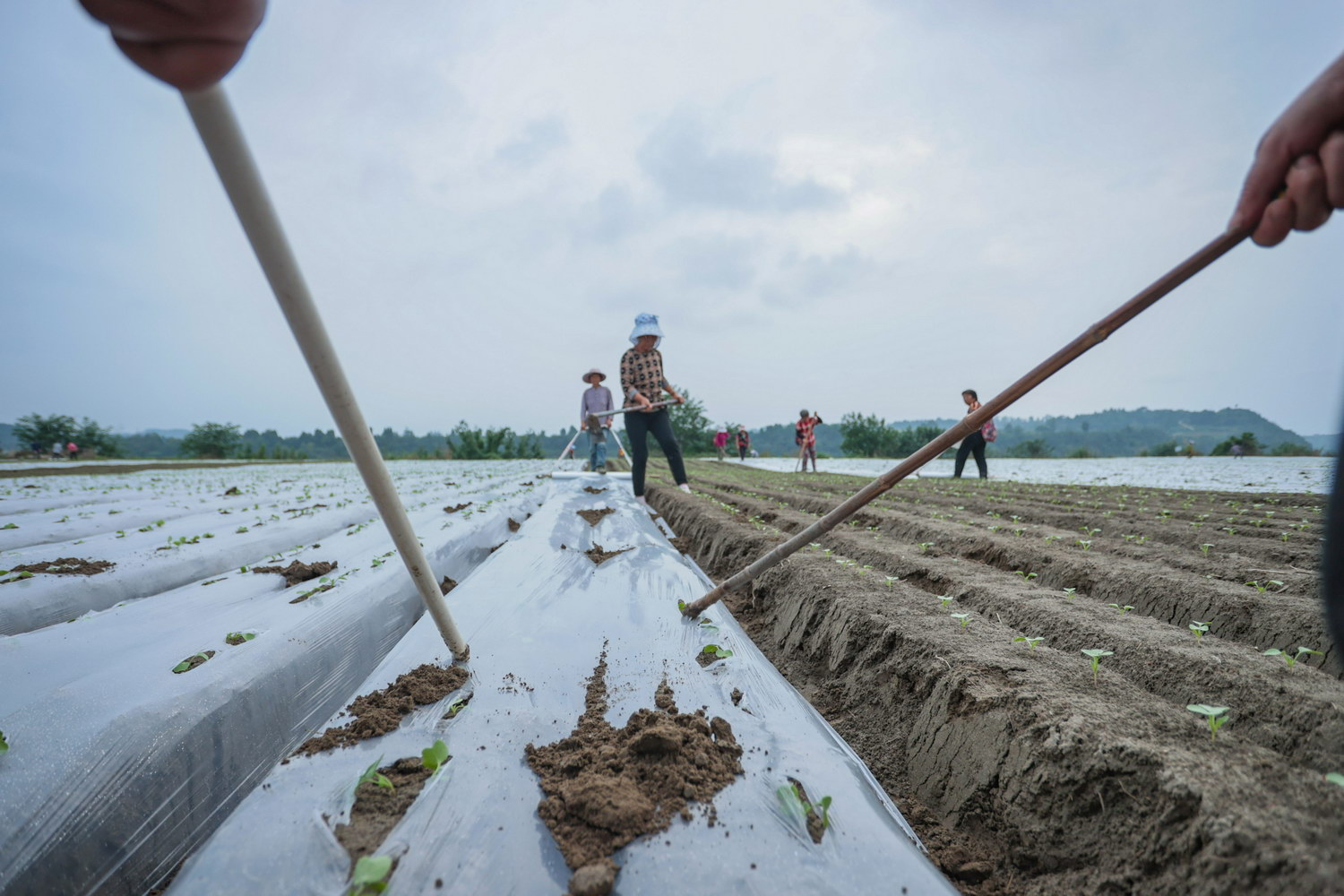 10月7日,位于遂宁市蓬溪县红江镇白坪村的渝遂绵优质蔬菜生产带蓬溪基地里,农户们正忙着给萝卜苗盖膜,进行精细化管护。一行行整齐的白色薄膜在秋日阳光下闪烁,与棕色的田垄交织成独特的田间画卷。