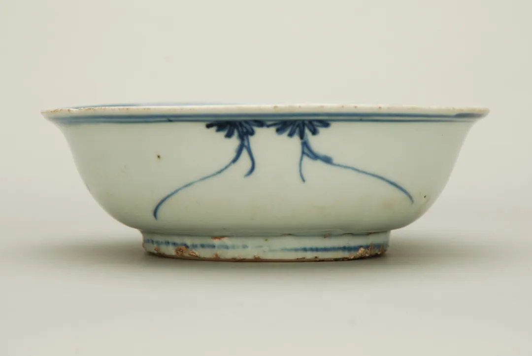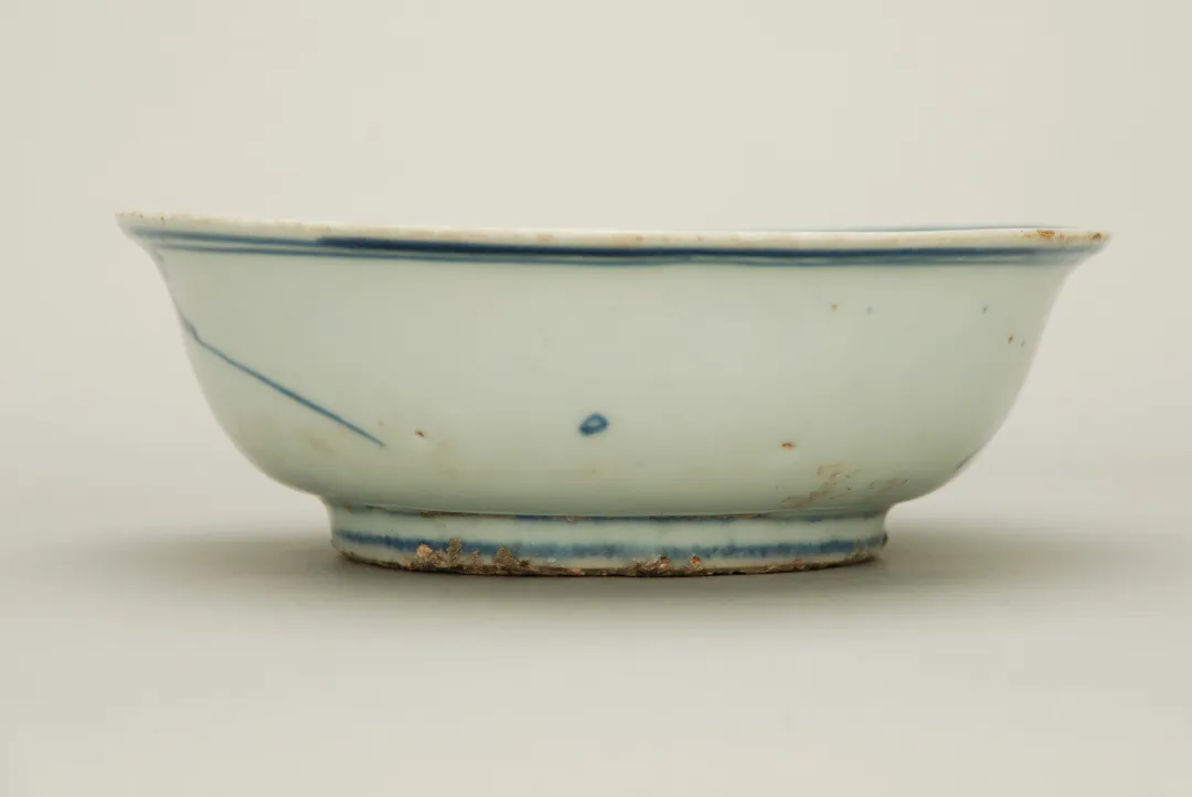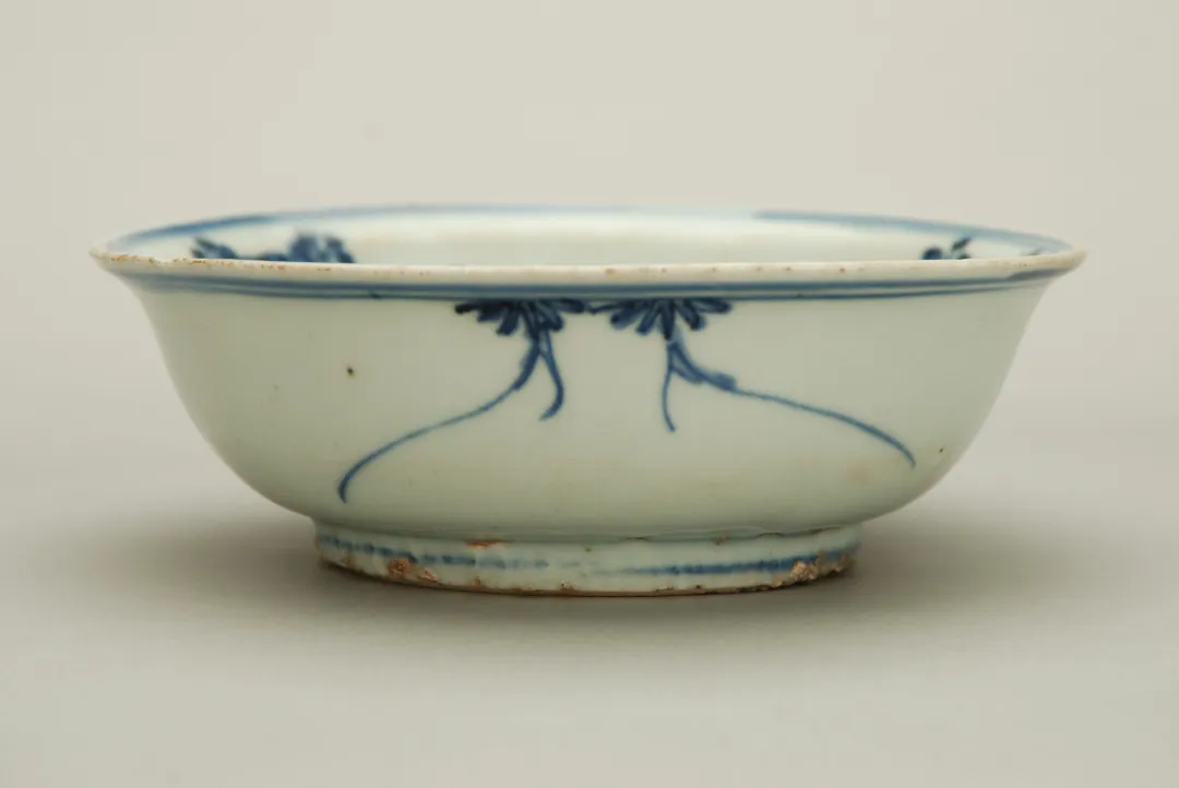 该碗青花呈色蓝中带灰,是明代中晚期青花料的典型色泽,这种颜色体现了当时青花料的使用特点以及烧制工艺的风格。