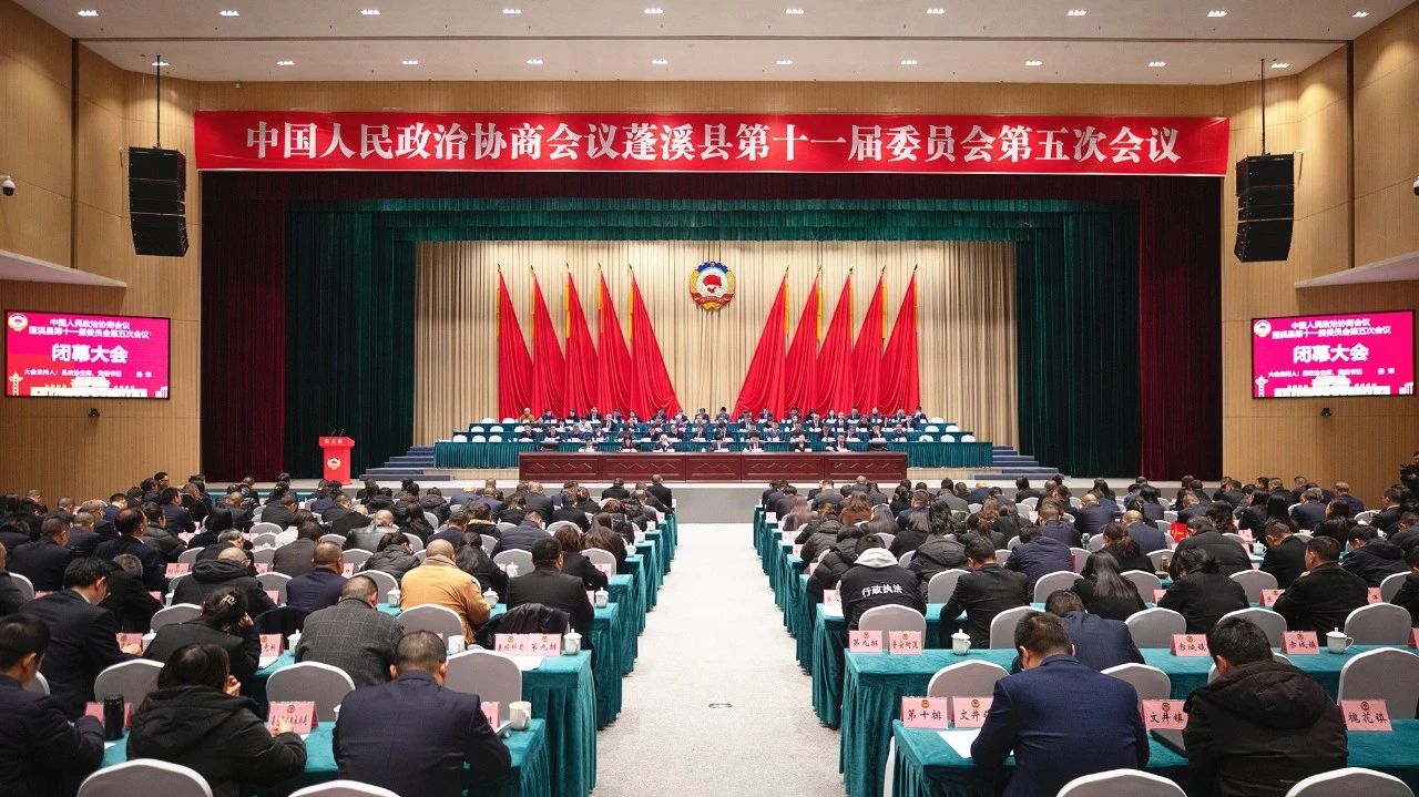 中国人民政治协商会议蓬溪县第十一届委员会第五次会议圆满完成各项议程,于2月25日下午在市民中心闭幕。县政协主席杨军主持闭幕会并讲话。闭幕会的执行主席是:杨军、蒋勇、廖芳、蒋亚藜、王波、徐鑫全。县人大常委会主任杨帆,中共蓬溪县委副书记何云峰、张淀渲应邀出席并在主席台就座。