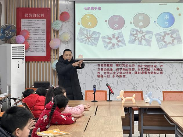 首先,来自中医医院的双报到党员余海东医生成为了孩子们的“健康导师”。余医生详细地讲解了如何预防疾病以及养成良好卫生习惯的重要性。在洗手环节,他手把手地教孩子们正确的洗手方法,让孩子们明白小手洗干净,健康有保障。同时,余医生还特别关注孩子们的自我保护意识培养,通过生动的案例和深入浅出的讲解,教孩子们如何应对性侵犯,告诉他们要勇敢地对危险说“不”,保护好自己的身体。为了让孩子们更好地理解心理健康知识,余医生巧妙地运用动画形式,直观地展示了不良情绪的危害,引导孩子们养成良好的心理情绪,学会积极面对生活中的小烦恼。