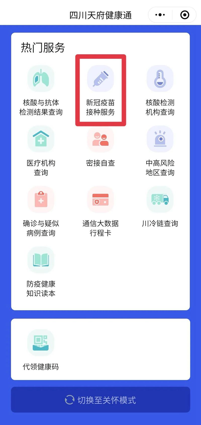 在四川的朋友们可通过“四川天府健康通”小程序首页的“新冠疫苗接种服务”进行新冠疫苗接种预约登记,预约成功后在指定时间前往接种单位进行接种即可。