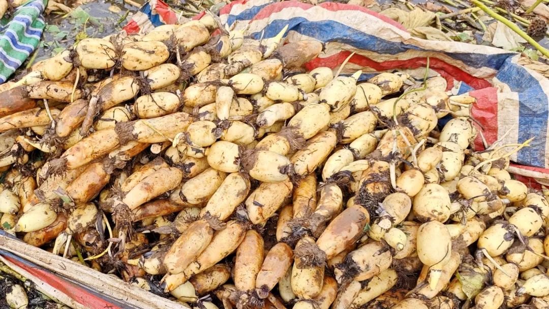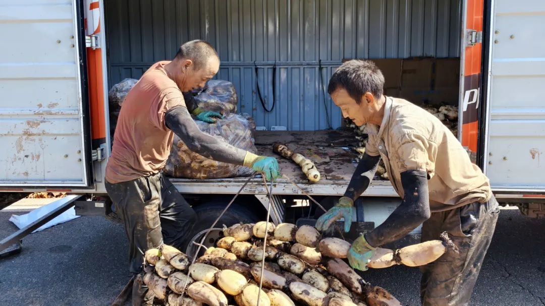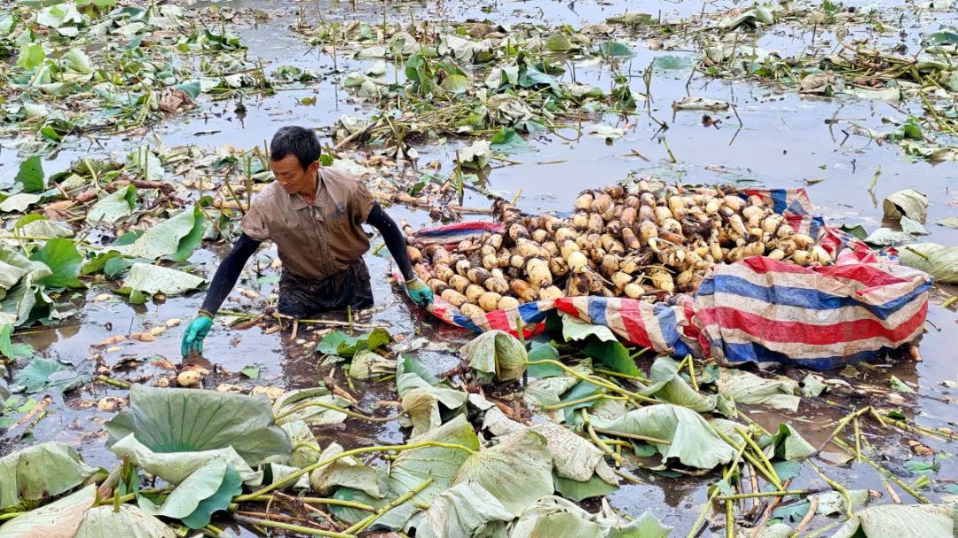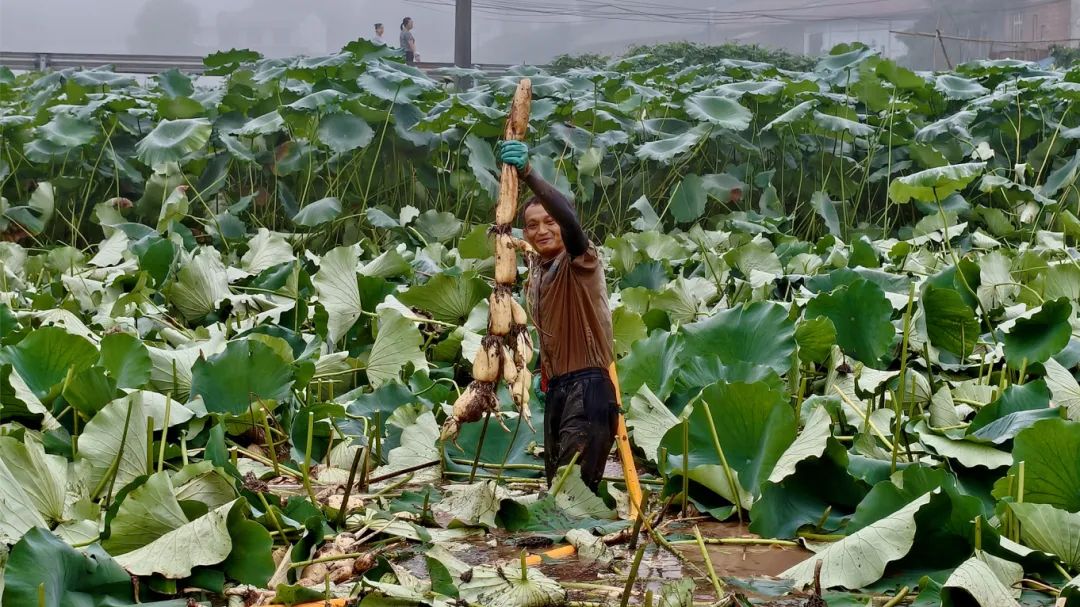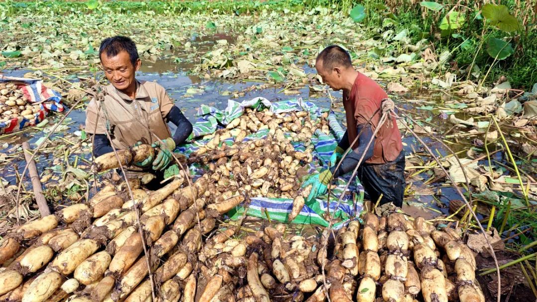 值得一提的是,该基地采用梯度种植的方式,种植了珍珠藕、大白胖等“早、中、晚”不同成熟期的莲藕品种。这种科学的种植模式,让采收季可以从当年7月持续至次年5月,实现了莲藕供应的不间断,为市场持续输送新鲜优质的莲藕。