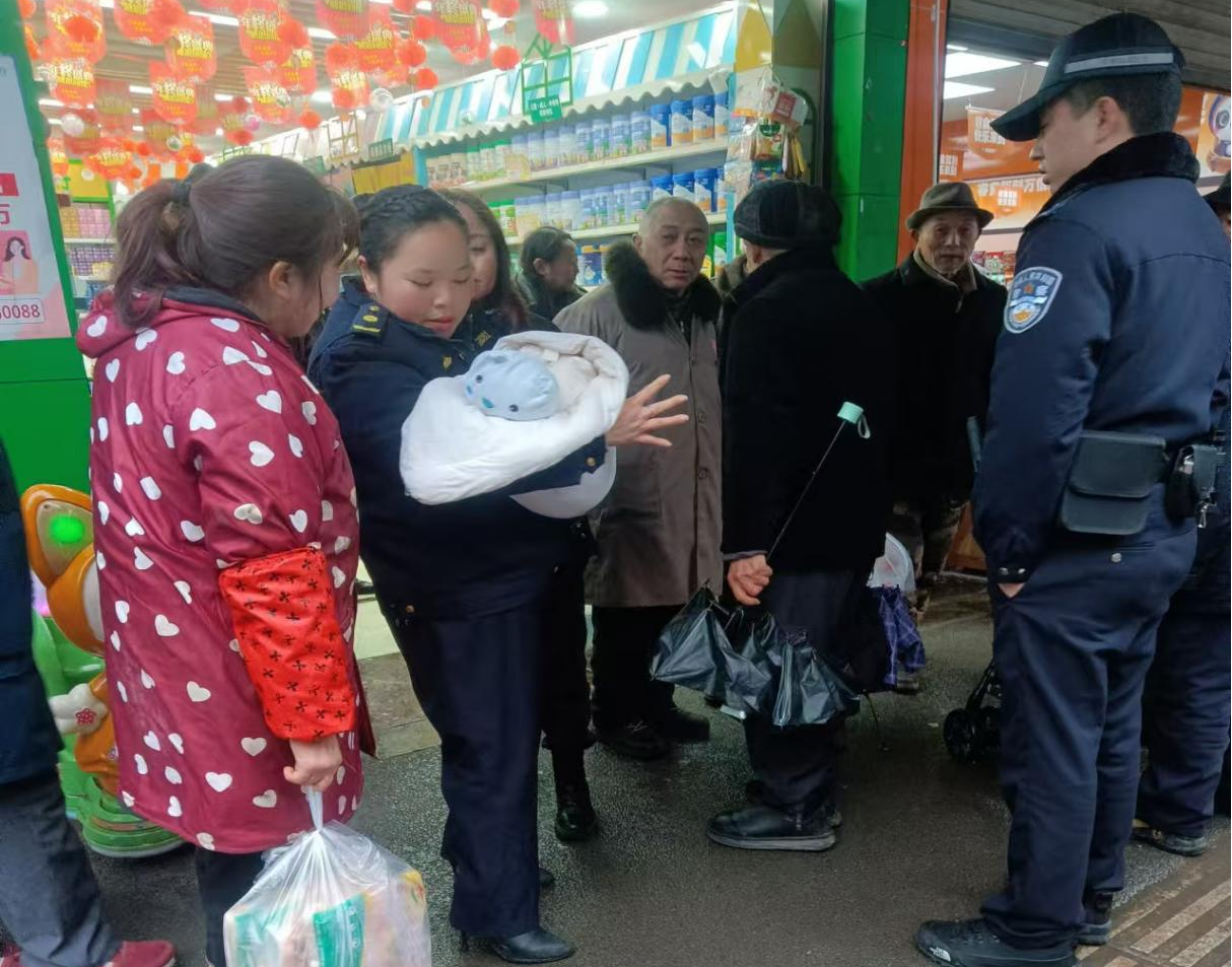 2月24日上午9时许,蓬溪县综合行政执法局赤城中队队员王小清在新建街口例行巡逻时,发现一名神情异常的女子推着婴儿车在河边徘徊。王小清敏锐地觉察到情况不对,立即上前询问。突然,该女子情绪激动,从婴儿车中拿出奶瓶扔入河中。王小清迅速反应,将婴儿车护在怀里,围观群众也纷纷拨打报警电话。由于婴儿下半身未穿衣服,冻得瑟瑟发抖,王小清立即将婴儿抱至附近奶粉店,用毯子将其全身包裹。