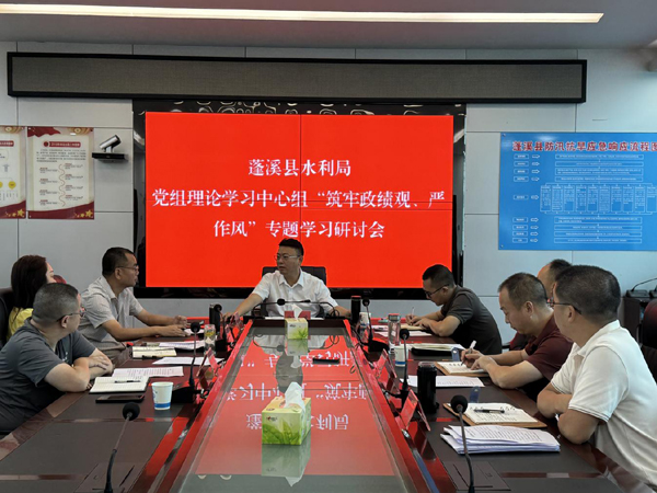 2025年6月25日,蓬溪县水利局召开党组理论学习中心组“筑牢政绩观、严作风”专题学习研讨会。会议由党组书记、局长曾小东主持,局领导班子成员和机关党委办相关人员参会。