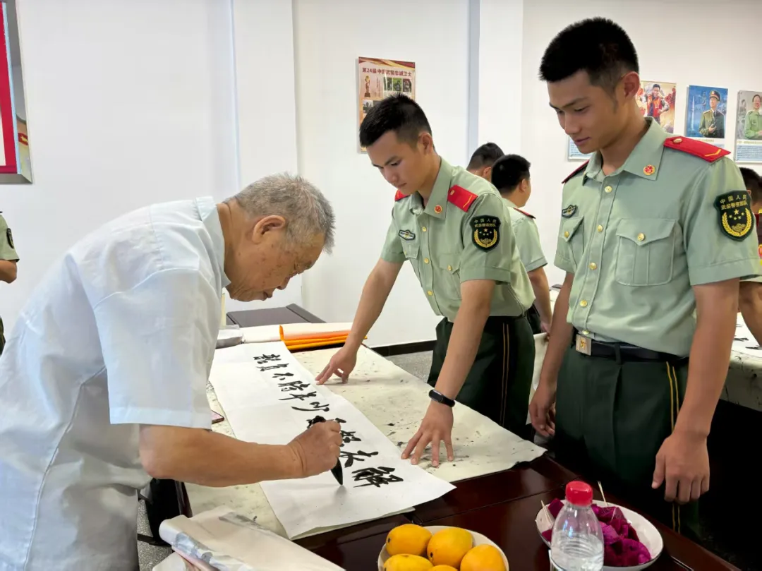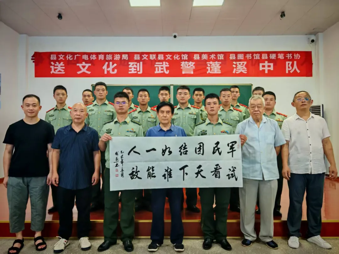 在“八一”建军节即将到来之际,蓬溪县武警中队开展了一场承载着书法之乡拥军深情的“书法文化进军营”专场活动。此次活动由县文化广电体育旅游局、县文联主办,县文化馆、县美术馆、县图书馆与县硬笔书法家协会承办,旨在以书法文化为纽带弘扬拥军优属传统,深化军民鱼水深情。县硬笔书法家协会五位书法家走进武警蓬溪中队,以笔墨为媒、以丹青为礼,为坚守岗位的官兵们送上了独具意义的节日祝福,向可爱的武警官兵们表达敬意与关怀,丰富军营文化生活。