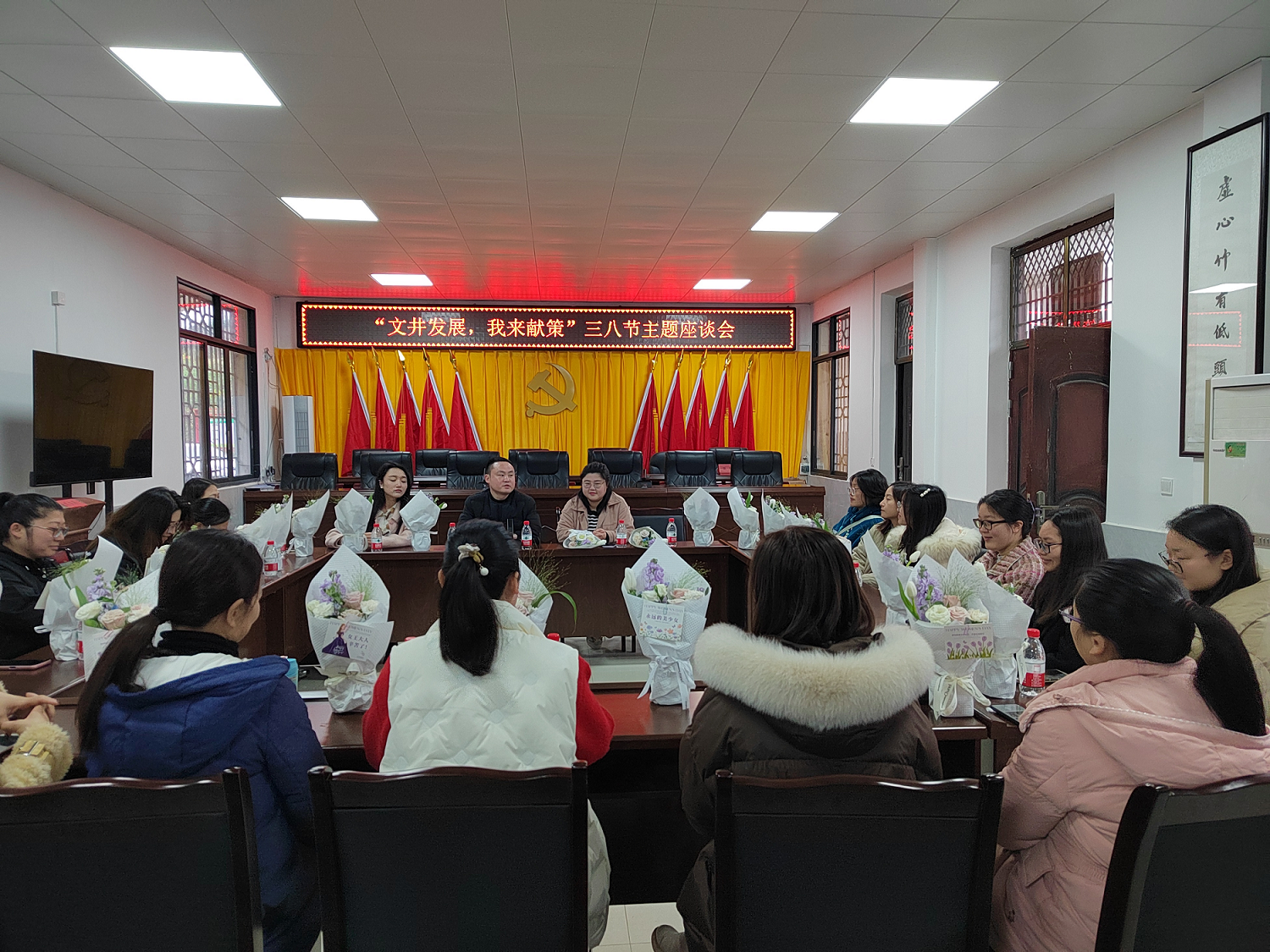 阳春三月,大地回暖。在国际三八妇女节来临之际,为增强女干部的工作积极性和创造性,发扬“团结拼搏、开拓进取、与时俱进、无私奉献”的精神,文井镇政府工会邀请镇机关全体女性干部召开“文井发展,我来献策”座谈会。