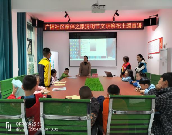 清明时节雨纷纷,文明祭祀树新风。2024年4月4日上午,普安街道广福社区新时代文明实践站、童伴之家开展清明文明祭祀主题宣讲。宣讲过程中,志愿者向小朋友们讲解有关清明节的由来、习俗等,倡导大家要传承清明节中渗透的优秀文化精髓,用小手牵起家人、亲戚、邻居的大手,通过献一束花、敬一杯酒、植一棵树、讲一段故事等文明方式,缅怀先人、寄托哀思。