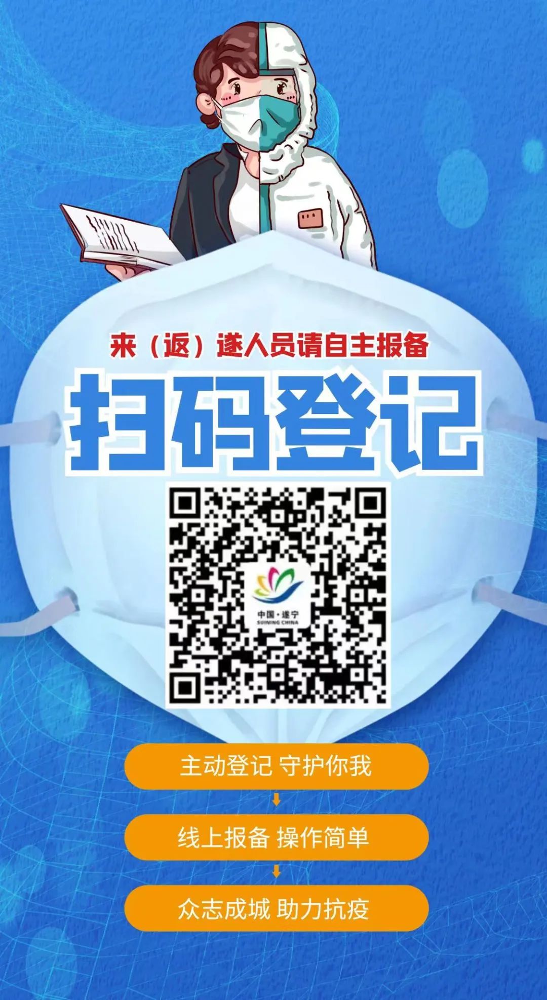 请所有省外来(返)遂人员落实“入川即检”,省外、省内市外来(返)遂人员落实“入遂即报”,通过自主报备二维码或电话向目的地社区(村)、单位或入住酒店等报备行程,并按要求配合落实集中隔离、居家隔离、居家健康监测等管控措施。因瞒报、虚报或未按规定落实防控措施,引发疫情传播风险或其他严重后果的,将依法追究法律责任。