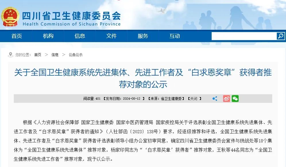 8月12日,四川省卫生健康委员会网站发布《关于全国卫生健康系统先进集体、先进工作者及“白求恩奖章”获得者推荐对象的公示》。其中,蓬溪县人民医院党委书记、主任医师 杨旭平为“全国卫生健康系统先进工作者”推荐对象。