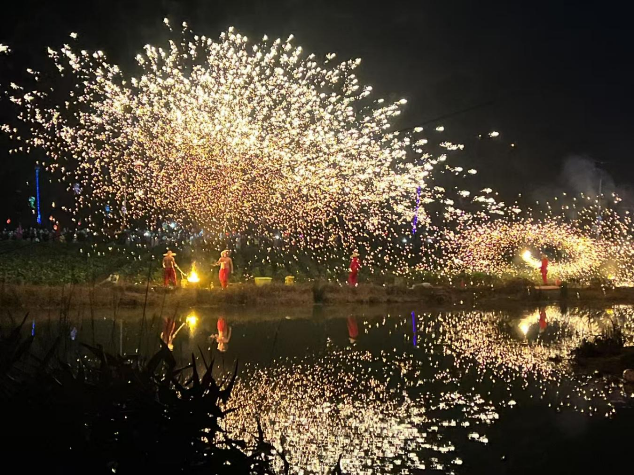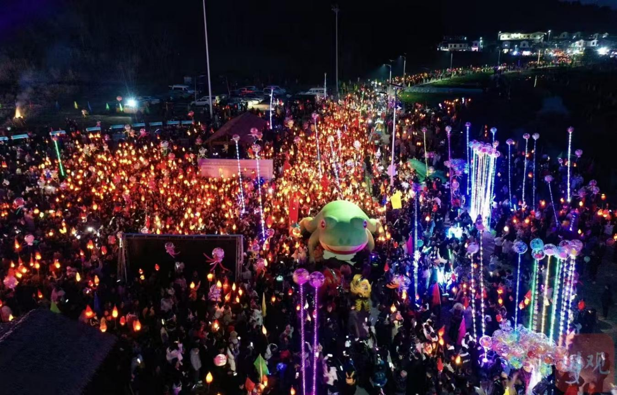 2月11日,蓬溪县文化旅游志愿服务大队联合文井镇新时代文明实践所在白鹤林村举办“送蛴蟆”民俗文化活动。活动以“送蛴蟆游行”为主线,结合文艺节目展演、舞龙舞狮、非遗集市、“摇嫩竹”许愿、千人品元宵、烟花秀和打铁花表演等环节,让游客体验“白天逛集市、夜晚赏灯游”。非遗传承人及志愿者现场教授游客制作“蛴蟆灯”,人们手持自制“蛴蟆灯”一同祈福,绵延数公里的游行队伍,营造出“灯火璀璨如星河”的视觉盛宴。