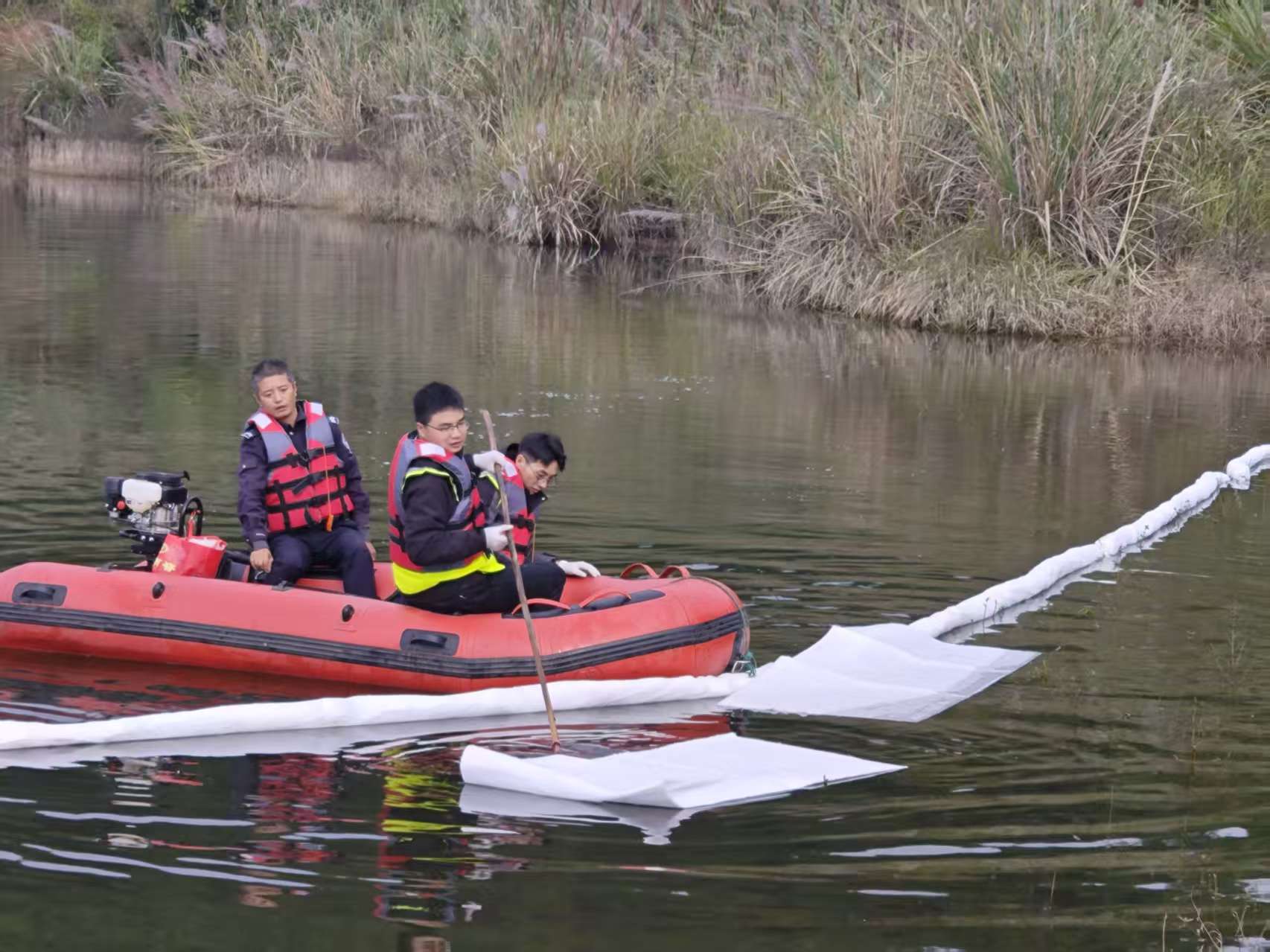 演练模拟险情发生后,巡查人员立即按程序上报,蓬溪生态环境局迅速启动应急响应,调集物资并组织监测、执法等力量第一时间赶赴现场,与省蓬灌局协同开展联合处置。现场迅速设立警戒区域,防止事态扩大;环境监测人员立即布设监测点位,对水体石油类等关键指标开展加密监测,实时跟踪污染动态;省蓬灌局科学调度水库运行,为应急处置创造有利条件;应急救援队伍快速铺设围油拖栏控制污染扩散,并使用吸油毡进行吸附清理。整个处置过程衔接紧密、响应迅速、操作规范,展现出良好的协同作战能力。