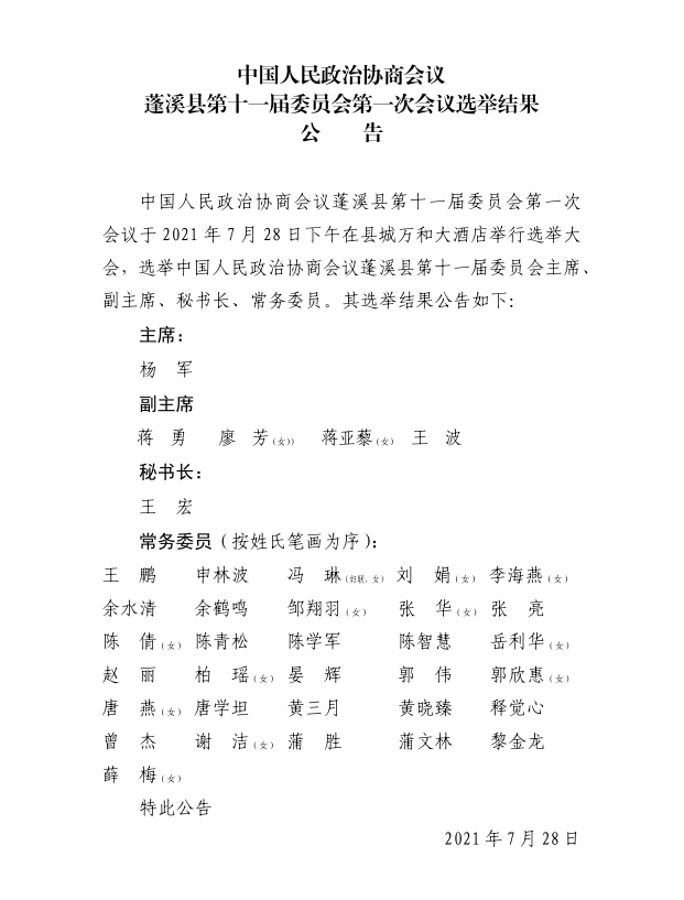 【聚焦两会】中国人民政治协商会议蓬溪县第十一届委员会第一次会议选举结果公告