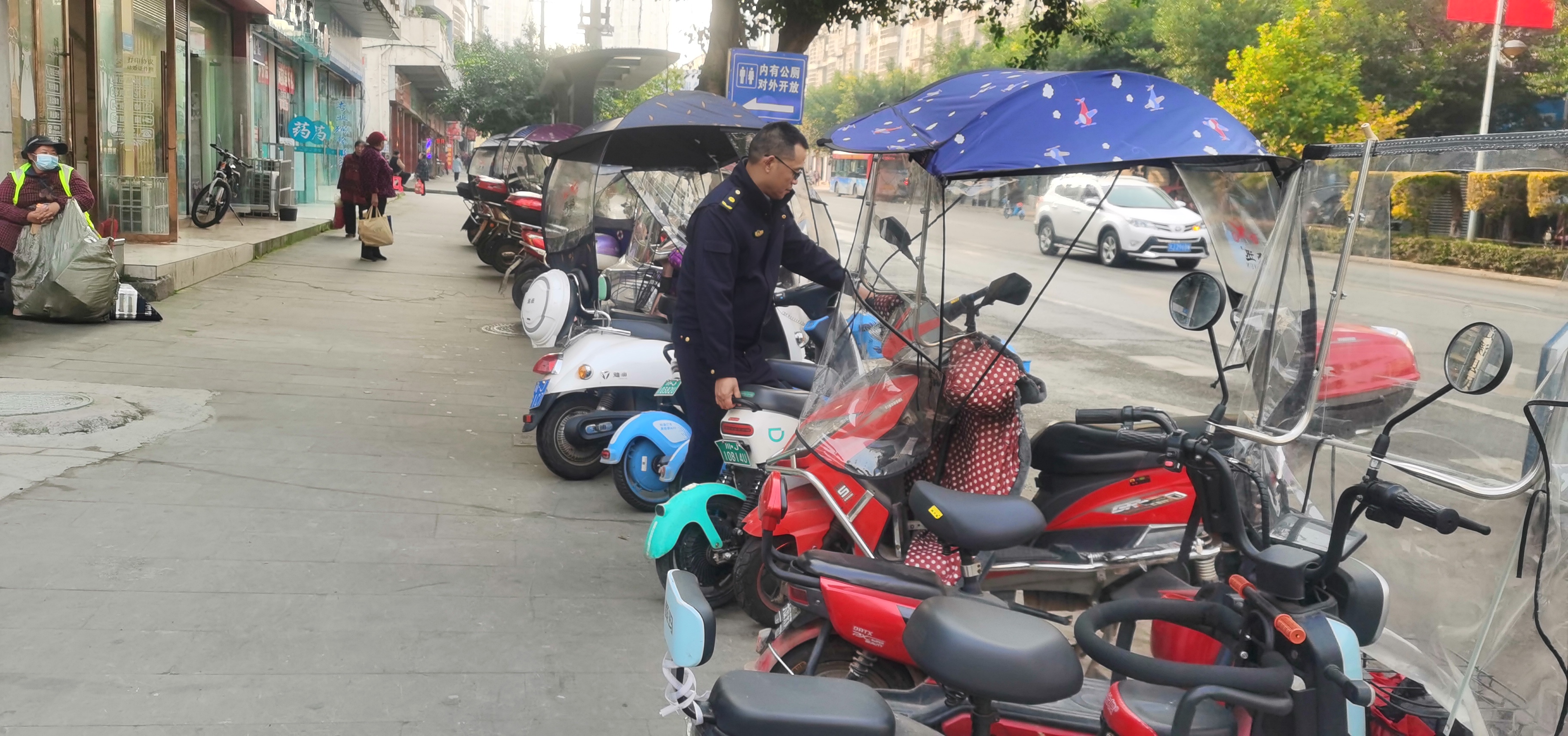 针对沿街商铺门前非机动车乱停放现象,执法人员采取“宣传+引导+服务”的方式,在日常执法过程中向沿街商户详细讲解“门前五包”责任,向周边居民宣传市容秩序相关法律法规,告知非机动车乱停乱放、占用盲道的不良影响,引导商户自觉维护门前停车秩序,劝导居民按照“入位、同向、整齐”的原则,自觉规范停放非机动车。