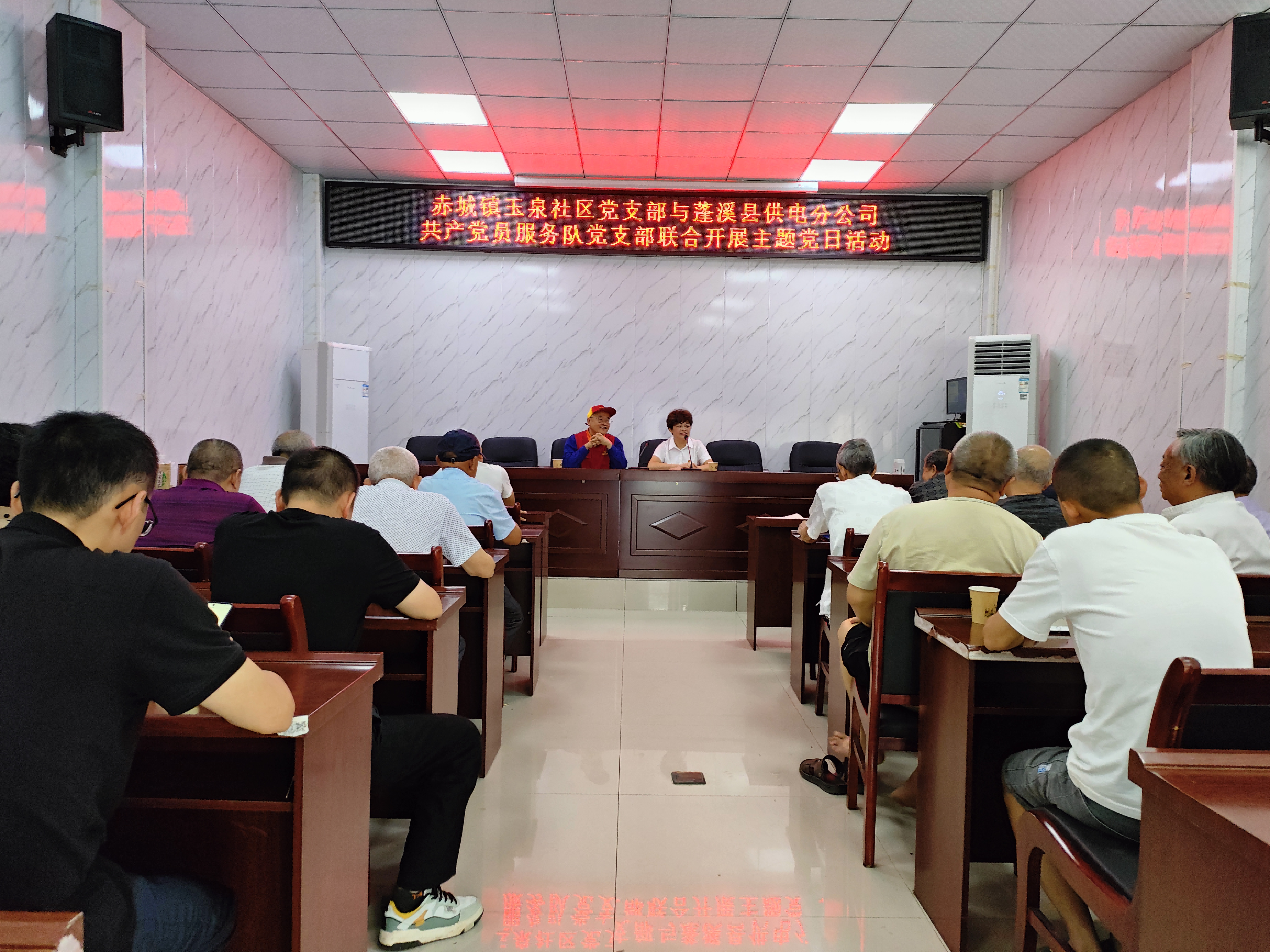 近日,赤城镇玉泉社区党支部联合蓬溪县供电分公司共产党员服务队党支部开展“社网联合,党送安全进万家”主题党日活动。活动中,党员志愿者们身穿红马甲,在辖区内各小区出入口、楼道口张贴安全用火用电用气宣传单,逐户发放安全宣传资料,并向沿街店面商户、居民讲解夏季安全用电的重要性,同时也营造了社区安全用电的良好氛围。