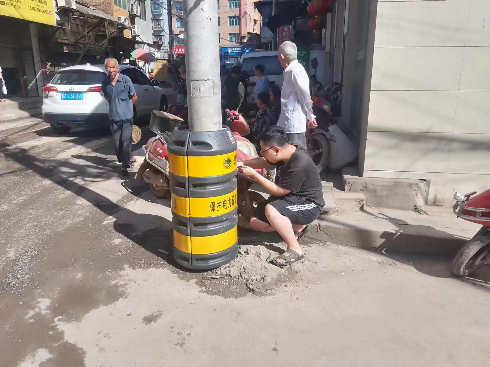 近日,为保障电路安全及行人行车安全,鸣凤镇组织工作人员安装电杆防撞桶。