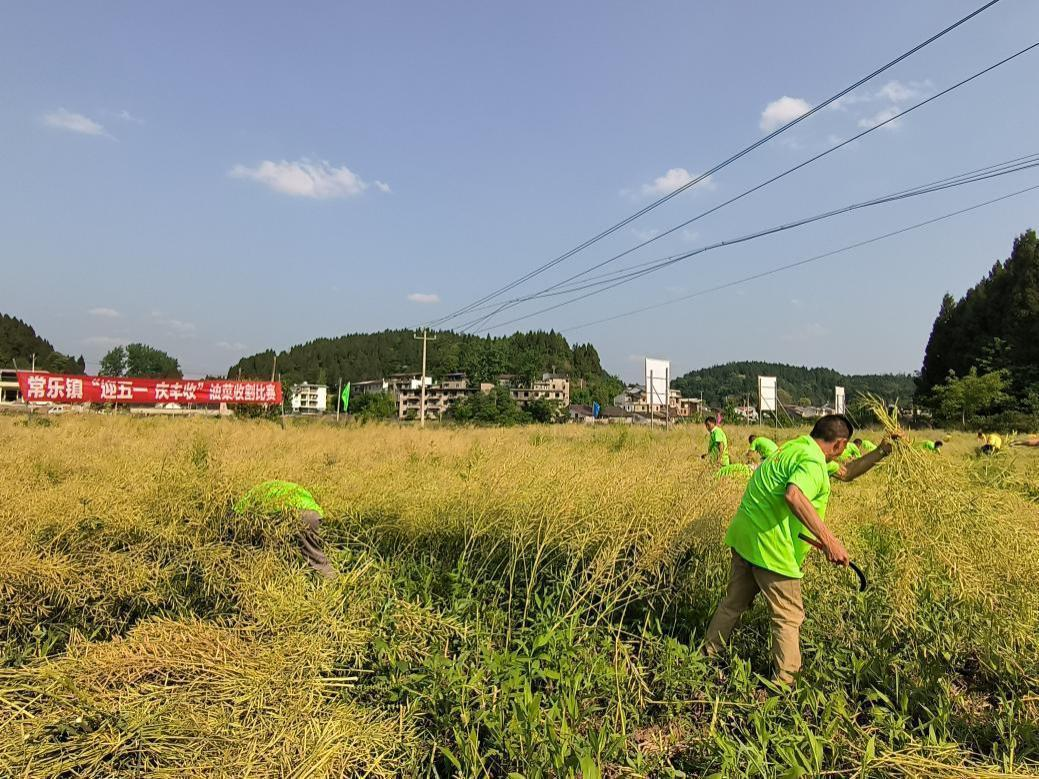 随后现场举办“迎五一、庆丰收”油菜收割比赛活动,参赛人员舞动镰刀,挥洒汗水,一排排油菜倒下,参赛选手与村民们在比拼中感受到丰收的喜悦,充分展现出新时代农民勤劳、团结、奋进的精神风采。